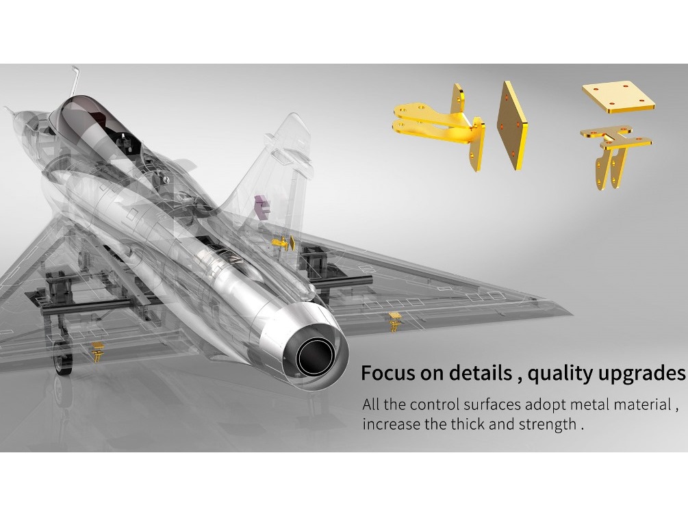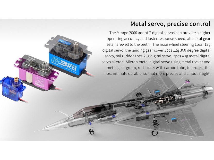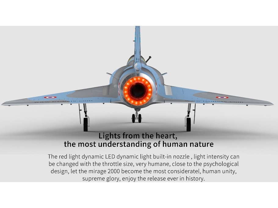 TURBO Mirage-2000 – in der PNP Version, vorbereitet für den Einbau einer 6kg Turbine. Das Modell ist weitgehend vorgefertigt und innert kurzer Zeit bereits flugfertig. Die Mirage verfügt über ein gefedertes, elektrisches Aluminium-Einziehfahrwerk mit elektrischer Bremse. Alle Komponenten wie das gefederte Fahrwerk, Tanks, Schubrohr, Digital-Servos, Smokepumpe, u.s.w, sind bereits eingebaut.