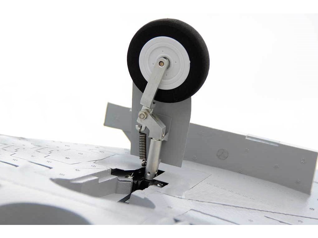 Dank dem geschleppten Hauptfahrwerk werden Stösse der Landebahn sauber gedämpft und die breite Spur sorgt für stabilen Geradeauslauf. Alle Komponenten wie 12-Blatt Impeller mit Inrunner-Motor, einziehbares Bug-Fahrwerk, Metallgetriebe-Servos und 100A Regler sind bereits eingebaut. Der Aufbau beschränkt sich auf wenige Montageschritte.
