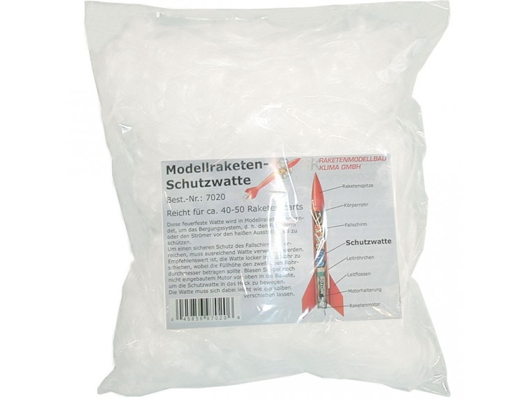 Diese feuerfeste Watte wird in Modellraketen verwendet, um das Bergungssystem, d.h. den Fallschirm oder Strömer, vor den heissen Ausstossgasen des Motors zu schützen. Der Packungsinhalt ist ausreichend für ca. 40-50 Raketenstarts.