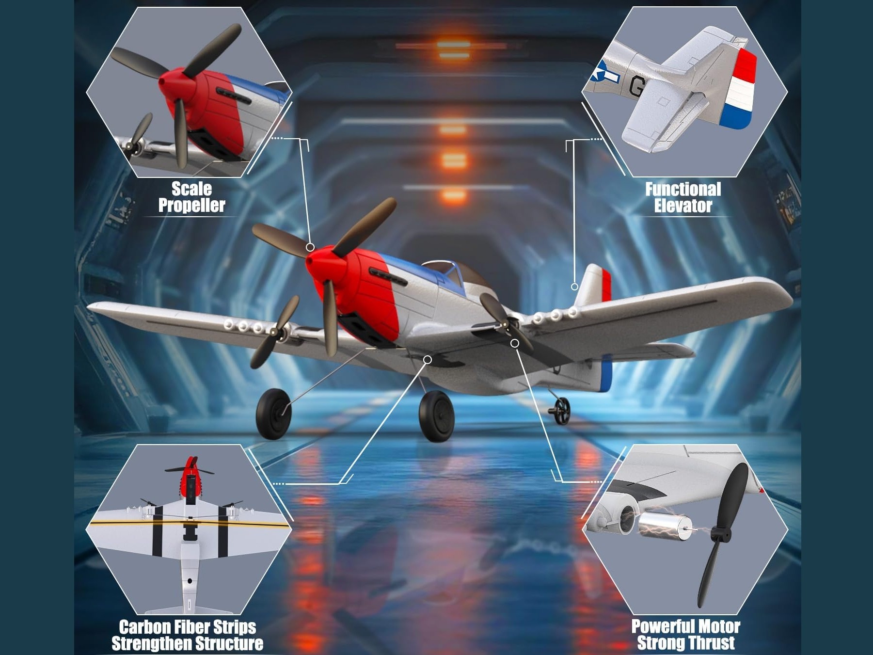 Wenn Sie eine originalgetreue P-51D Mustang kaufen möchten, bietet dieses 3-Kanal RTF Komplett-Set den idealen Einstieg in die Welt der ferngesteuerten Warbirds. Dank der Kombination aus robustem EPP-Schaum, Carbon-Verstärkungen und dem zuschaltbaren Gyro-System ist das Modell besonders fehlerverzeihend und stabil in der Luft. Die zusätzliche Steuerung über das Höhenruder macht diesen RC Warbird zu einem vielseitigen Trainer für angehende Modellpiloten, die Wert auf eine realistische Flugoptik legen.