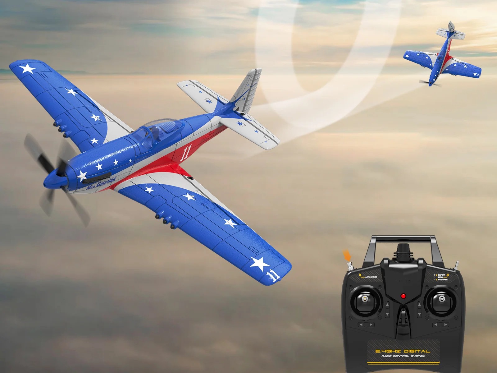 Dieser kleine Warbird wird als RTF-Komplett-Set angeboten. Der Motor und die komplette Elektronik sind bereits verbaut oder installiert. Weiter gehören auch der Akku, die RC-Anlage und ein 6-Achsen-Gyro zum Lieferumfang. Dank des integrierten 6-Achs-Gyro fliegt dieses Modell sehr ruhig und kann auch von Piloten mit wenig Erfahrung gut kontrolliert werden.