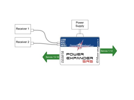Mit dem PowerExpander SRS ist es möglich, aus kleinen aber vollwertigen Empfängern alle Kanäle des Fernsteuersystems zu nutzen. Zusätzlich kann die Sicherheit deutlich erhöht werden, weil an den PowerExpander SRS zwei Empfänger angeschlossen werden können. Das eingebaute Serial Receiver System wählt einen beliebigen Empfänger aus und schaltet im Fehlerfall automatisch auf den noch arbeitenden Empfänger um.