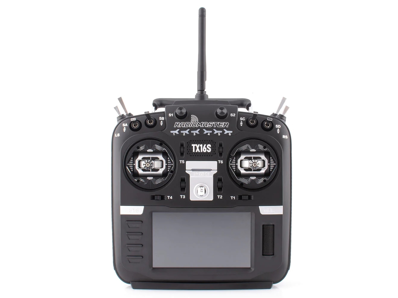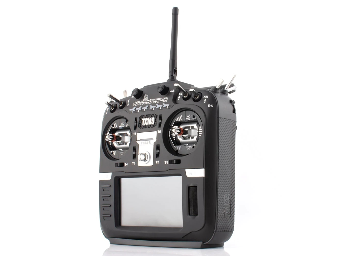 Die RadioMaster TX16S MK II – eine Fernsteuerung auf dem neuesten Stand der Technik. Der Sender verfügt über Hall Gimbals V4.0, ein internes 4in1-Modul, OpenTX und EdgeTX-Kompatibilität sowie eine 2.4-GHz-Funkfrequenz mit 16 Kanälen. Das aktualisierte Design umfasst eine leicht abnehmbare Batterieabdeckung, erhöhte und flache Griff-Mulden für eine bessere Ergonomie und verbesserte S1/S2-DrehKnöpfe mit einer Einraststellung.