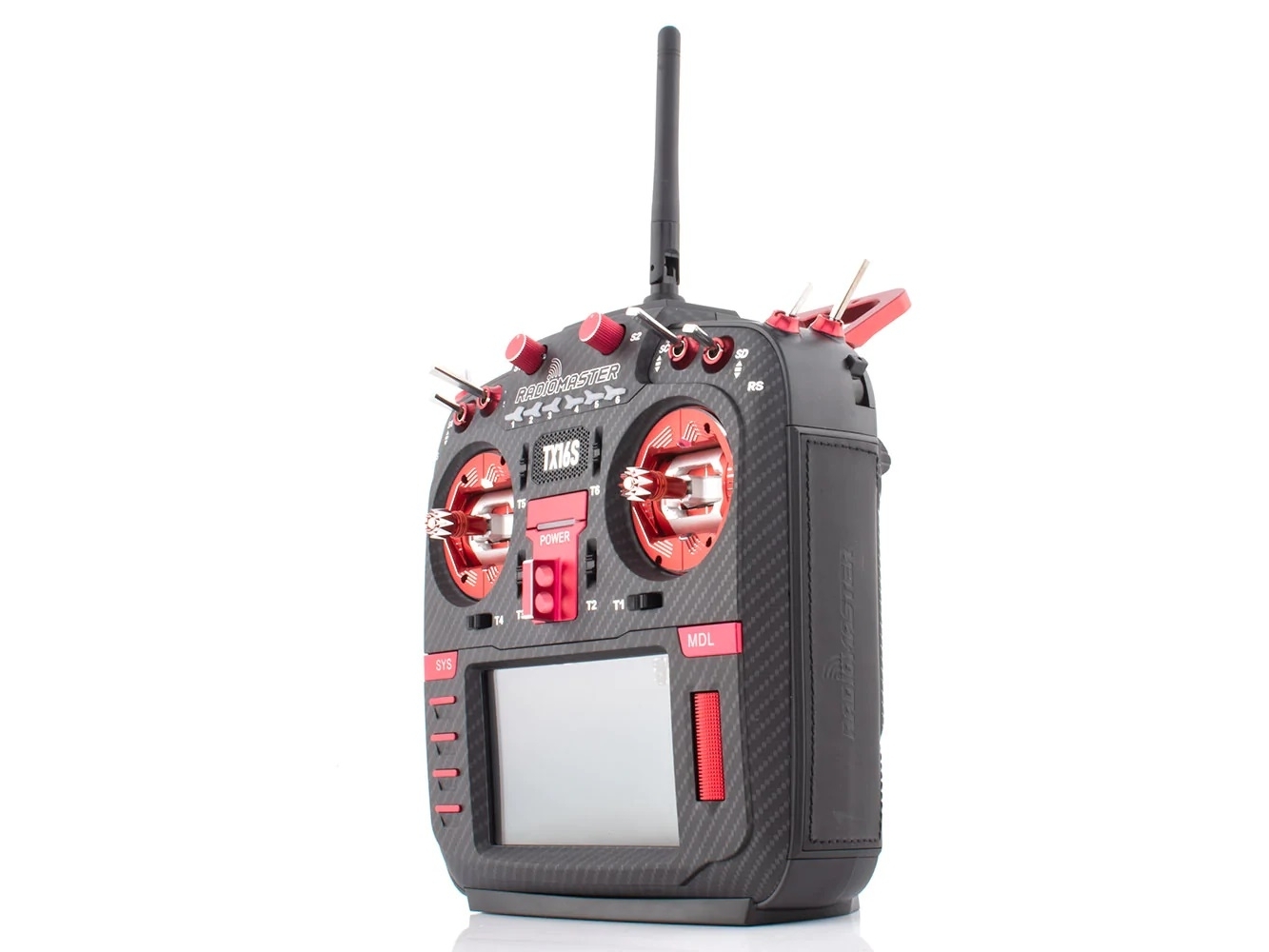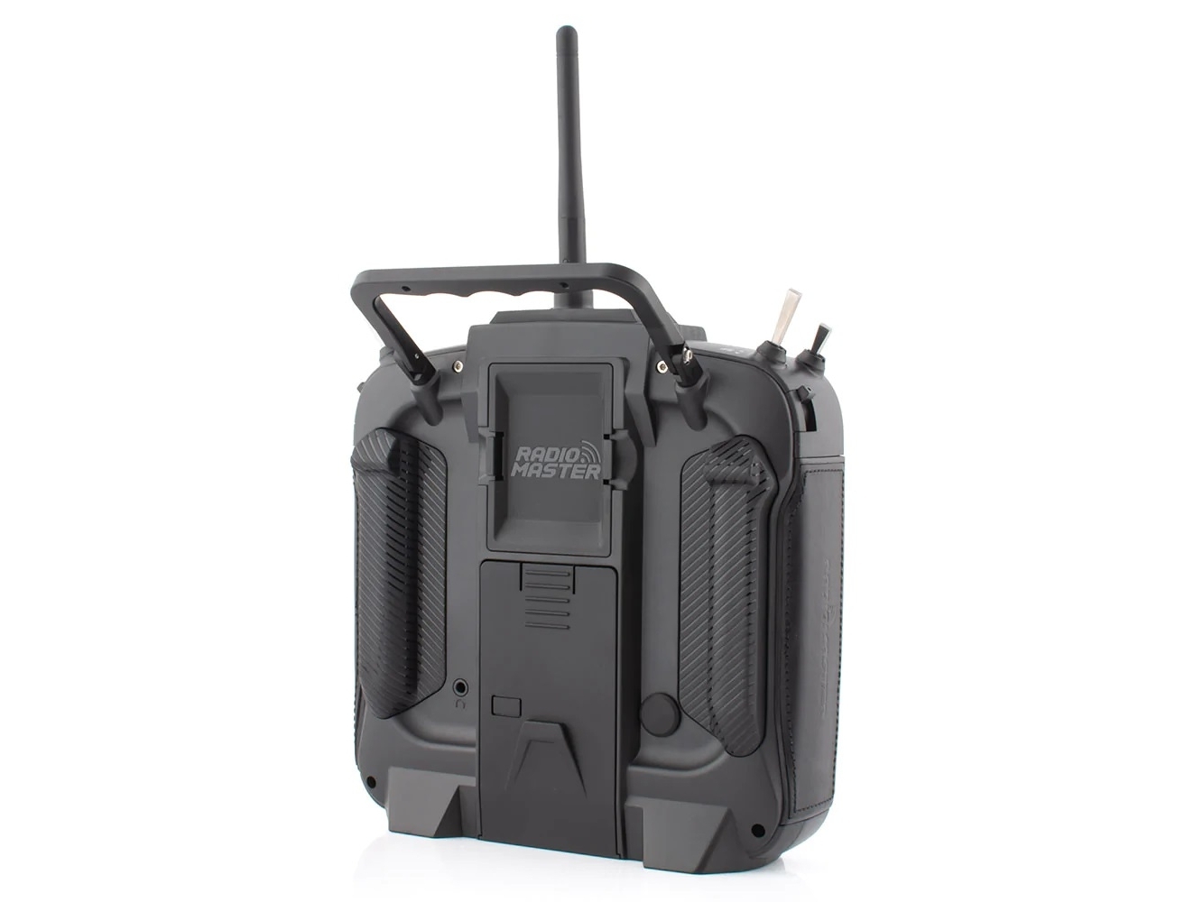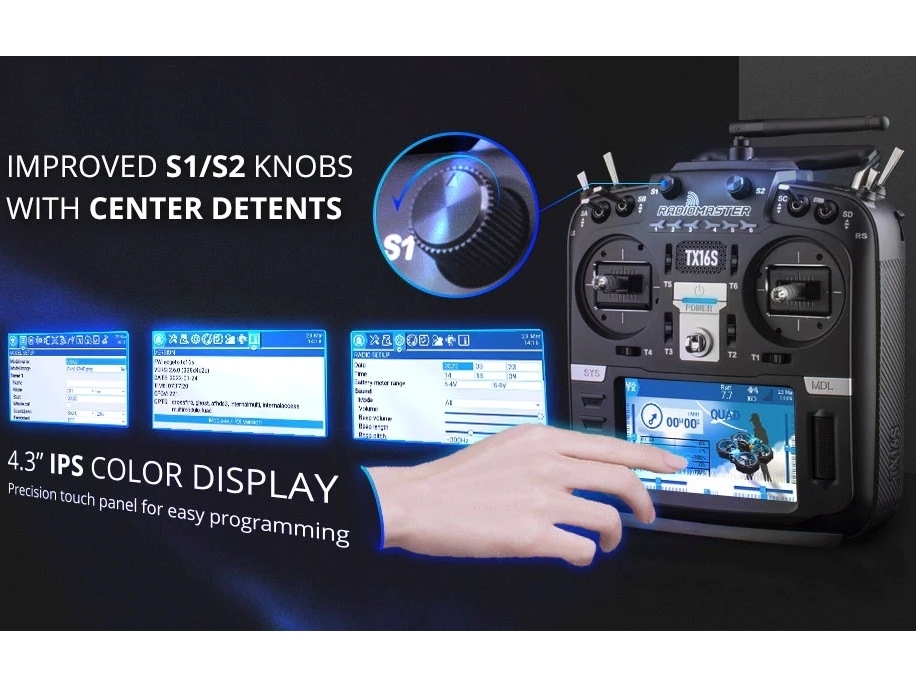 Die RadioMaster TX16S MK II – eine Fernsteuerung auf dem neuesten Stand der Technik. Der Sender verfügt über ein internes ELRS-Modul, OpenTX und EdgeTX-Kompatibilität sowie eine 2.4-GHz-Funkfrequenz mit 16 Kanälen. Das aktualisierte Design umfasst eine leicht abnehmbare Batterieabdeckung, erhöhte und flache Griff-Mulden für eine bessere Ergonomie und verbesserte S1/S2-DrehKnöpfe mit einer Einraststellung. Das 4.3 Zoll Farbdisplay ermöglicht eine einfache Programmierung mit Touch-Panel und die neue 3.5-mm-Audio-Kopfhörerbuchse und die eingebauten Dual-Lautsprecher bieten grossartige Audio-Optionen für Piloten.