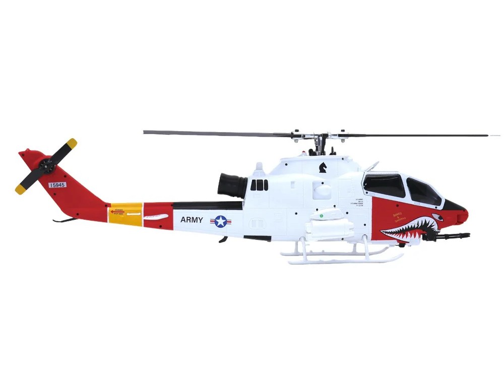 Der Scale Helicopter AH-1 Cobra im markanten rot-weissen Design ist ein hochdetaillierter Nachbau des legendären ersten reinen Kampfhubschraubers der Welt. Dieses Ready-to-Fly Set bietet sowohl Einsteigern als auch erfahrenen Piloten ein beeindruckendes Flugerlebnis und sorgt durch die integrierte Beleuchtung für ein authentisches Erscheinungsbild. Die integrierte GPS-Funktion in Kombination mit dem 6-Achs-Gyrosystem sorgt für maximale Sicherheit, während das hocheffiziente Brushless-System für kraftvolle und zugleich leise Flugeigenschaften sorgt. Hochwertige Materialien wie der Rotorkopf aus Aluminium und Nylon-Carbonfaser-Blätter garantieren Langlebigkeit und Präzision.