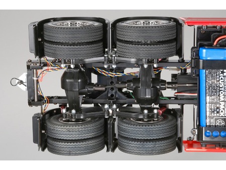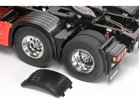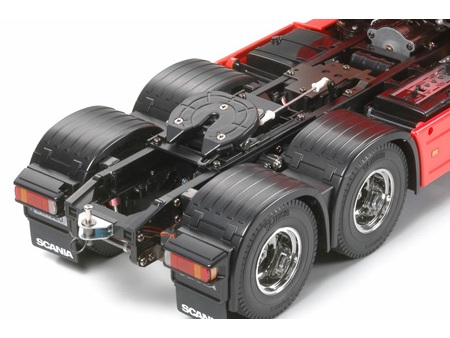 Mit der über 50cm langen und rund 3 kg schweren Nachbildung des Scania R620 lassen sich imposante Gespanne in einer neuen Dimension zusammenstellen. Unter dem nach vorne kippbaren Fahrerhaus findet sich die bewährte und robuste Tamiya-Trucktechnik. Ein kräftiger Elektromotor gibt über ein schaltbares 3-Gang-Getriebe seine Kraft an die beiden Hinterachsen ab. Ein detailgetreuer Aluminium-Leiterrahmen verleiht dem Modell die erforderliche Stabilität. Dank seines hohen Eigengewichts und einer Sattelplatte lässt sich der R620 mit allen Tamiya- und Carson-Aufliegern koppeln.