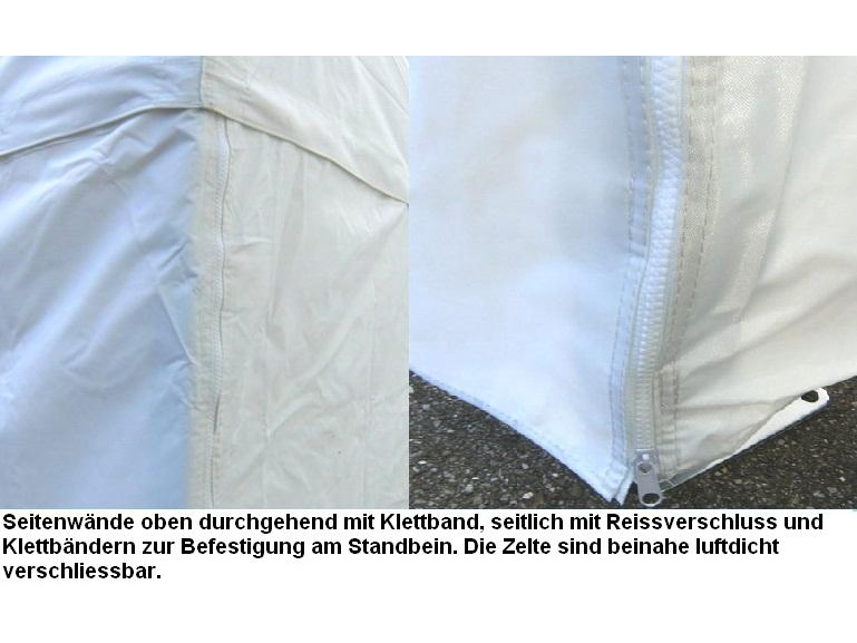 Die Seitenwände werden mittels Klettverschluss um die Eckpfosten befestigt und können dann mit dem Reisverschluss miteinander verbunden werden.