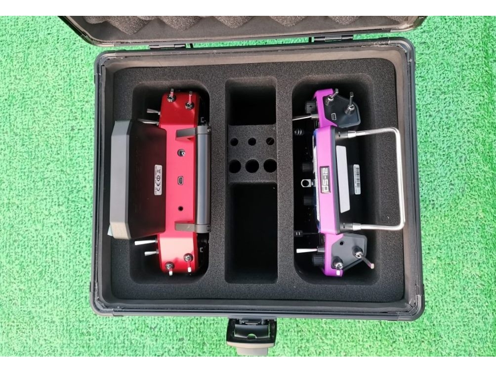 Dieser aus Aluminium gefertigte Senderkoffer bietet Platz für zwei Fernsteuerungen und weiteres Zubehör wie Sender-Gurt und Schraubendreher.