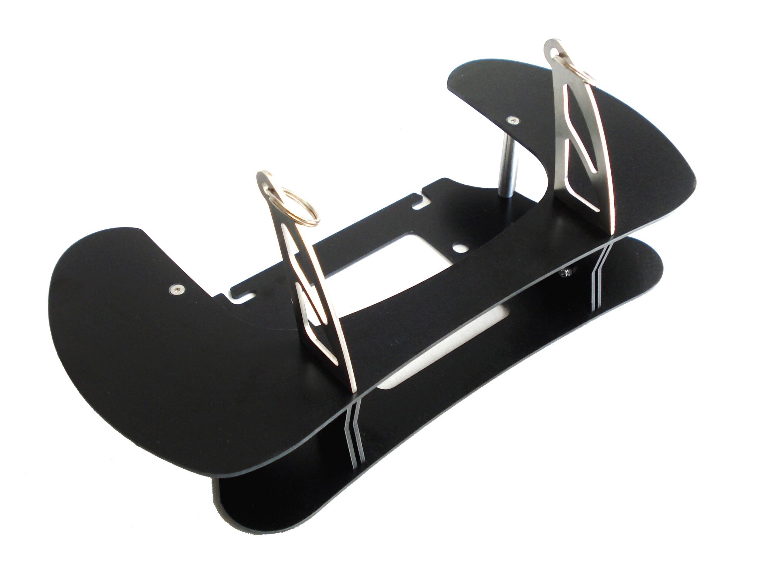 Das Pult ist aus hochwertigem Glasfaser-Kunststoff gefertigt, mit stabilen Aufhängebügeln aus Edelstahl woran der Sender optimal getragen werden kann. Alle Anschlüsse und das Akkufach des Senders sind frei zugänglich.