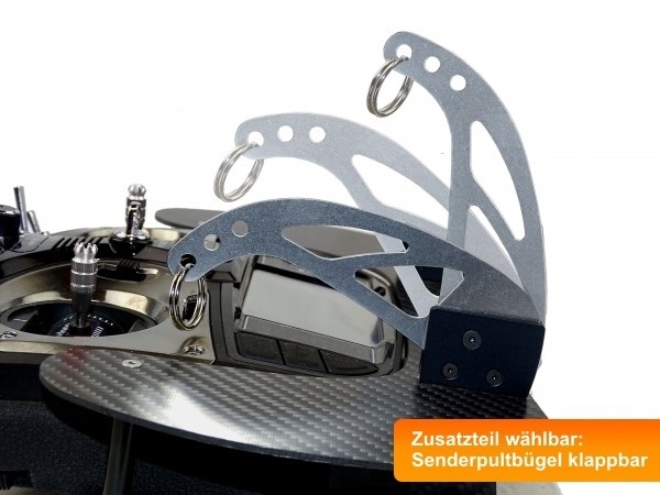 Sehr stabiles Senderpult im modernen Carbon Edelstahl Design mit echter und schöner Carbon 3K Köper-Oberfläche. Das Pult ist aus hochwertigem Carbon Compositwerkstoff mit stabilen, klappbaren Aufhängebügeln aus Edelstahl gefertigt. Alle Anschlüsse und das Akkufach des Senders sind frei zugänglich.
