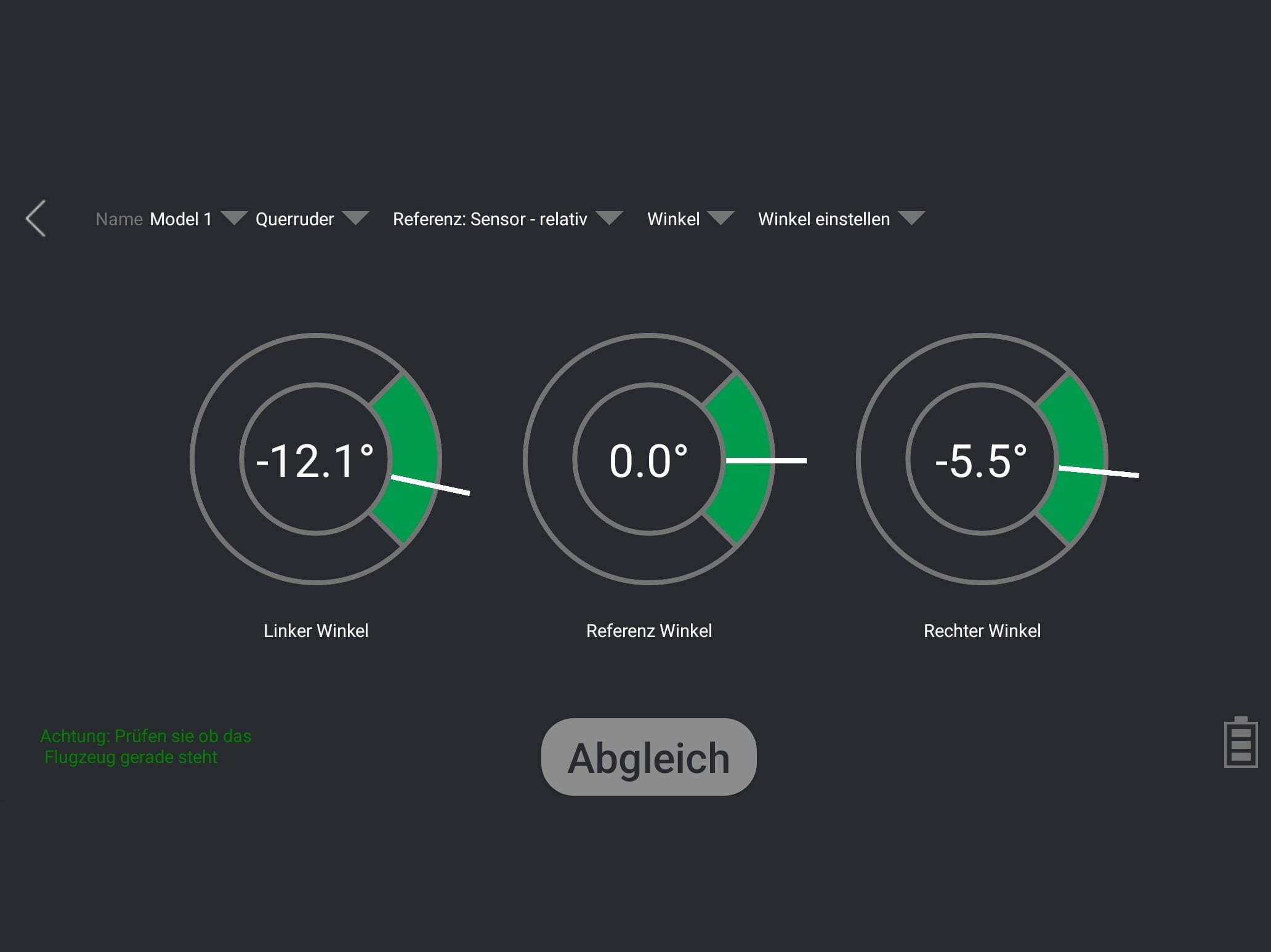 Der Ruderausschlag kann in Grad oder Milimetern gemessen werden.