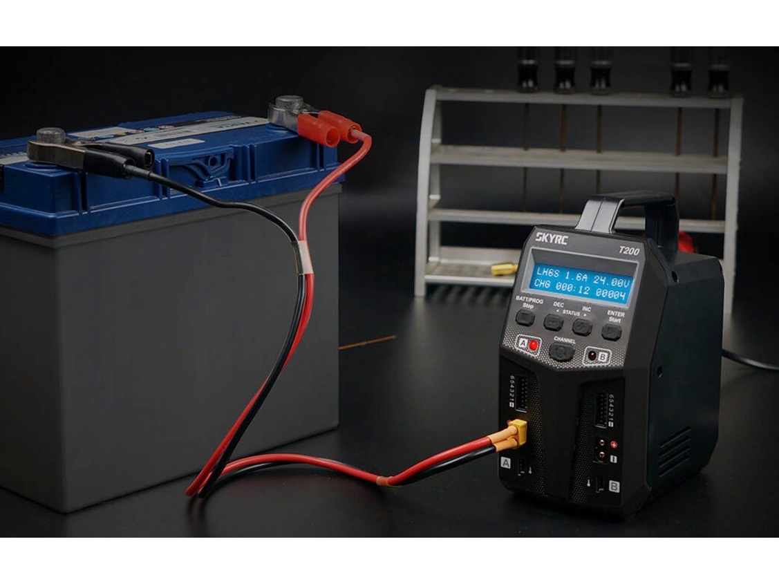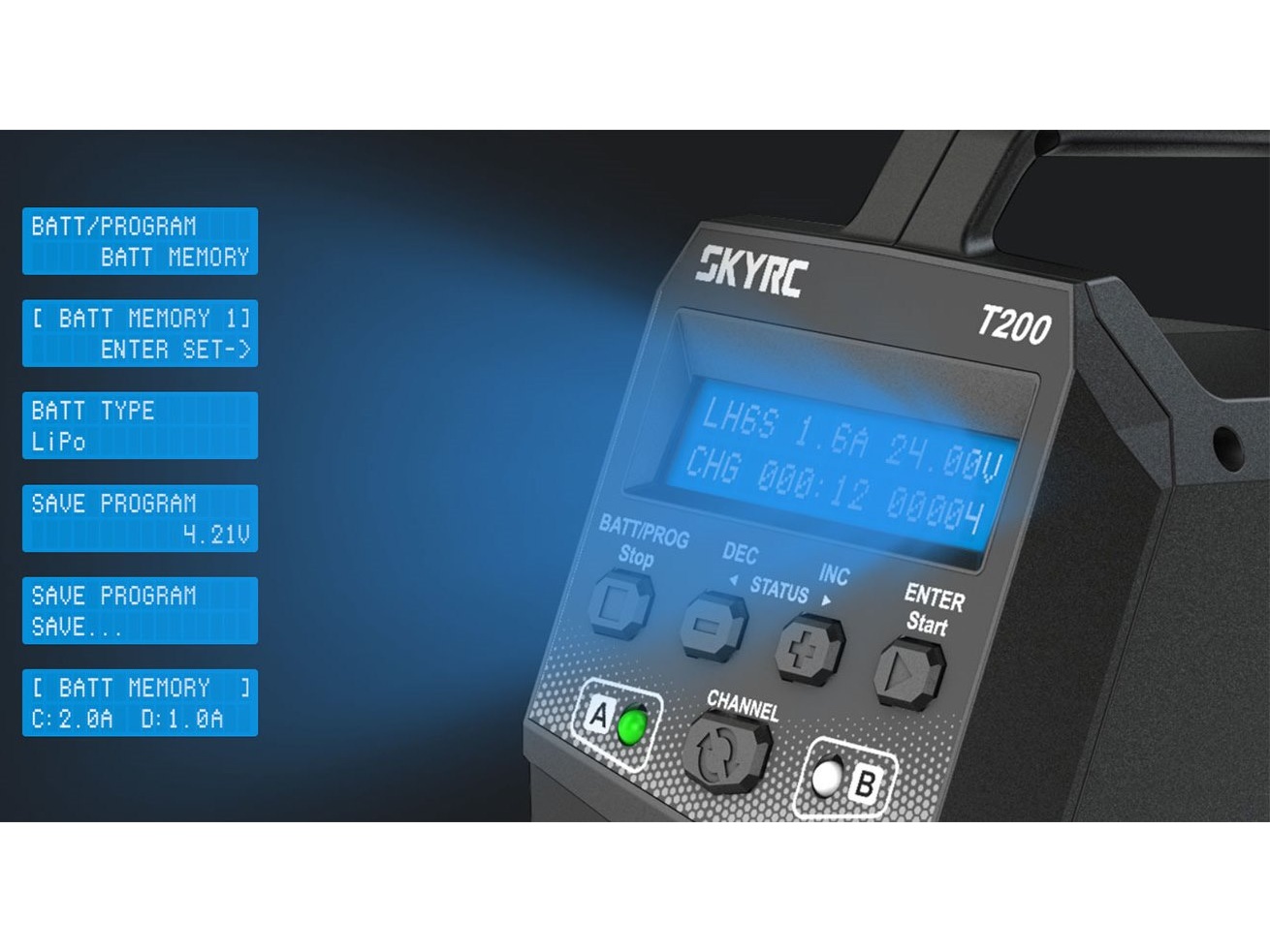 Das SkyRC T200 ist ein universelles Multifunktionslade- / Entladegerät mit dem die gängigsten Akkutypen wie LiPo/LiHV/Lilon/LiFe/NiCd/NiMH/Pb verwendet werden können. Mit beachtlichen 2x 100 Watt Ladeleistung stellt der T200 im kompaktem Gehäusedesign mehr als ausreichend Ladeleistung für die meisten Anwendungen bereit. Das SkyRC T200 bietet alle üblichen Lade- und Entlademodi wie: Charge, Ballance-Charge, Fast-Charge, Storage und Discharge.