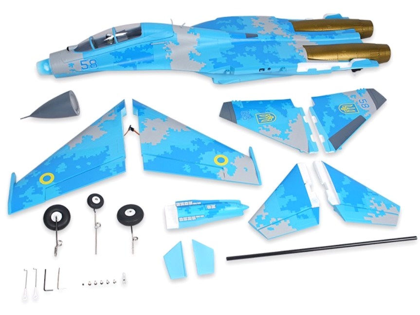 Das XFly-Modell ist ein detailgetreuer Nachbau des SU27-Kampfjets und wird als PNP-Set mit Antrieb und Servos ausgeliefert. Die beiden 50mm Impeller erzeugen mit einem 4S-LiPo Akku ein Schubverhältnis von nahezu 1:1. Die 12-Blatt Rotoren sind ausgewuchtet und verrichten in Verbindung mit den beiden 40A Reglern eine ausserordentliche Arbeit. Das Modell hat sehr gute Flugeigenschaften und ist auch für weniger geübte Piloten einfach zu fliegen. Ein Start aus der Hand ist ebenso problemlos möglich wie der Start von kurzem Gras oder einer Hartpiste. Alle zum Bau benötigten Kleinteile sind im Lieferumfang enthalten. Alle Servos, der Impeller mit Brushless Motor sowie der Regler sind bereits fertig verbaut und verkabelt.
