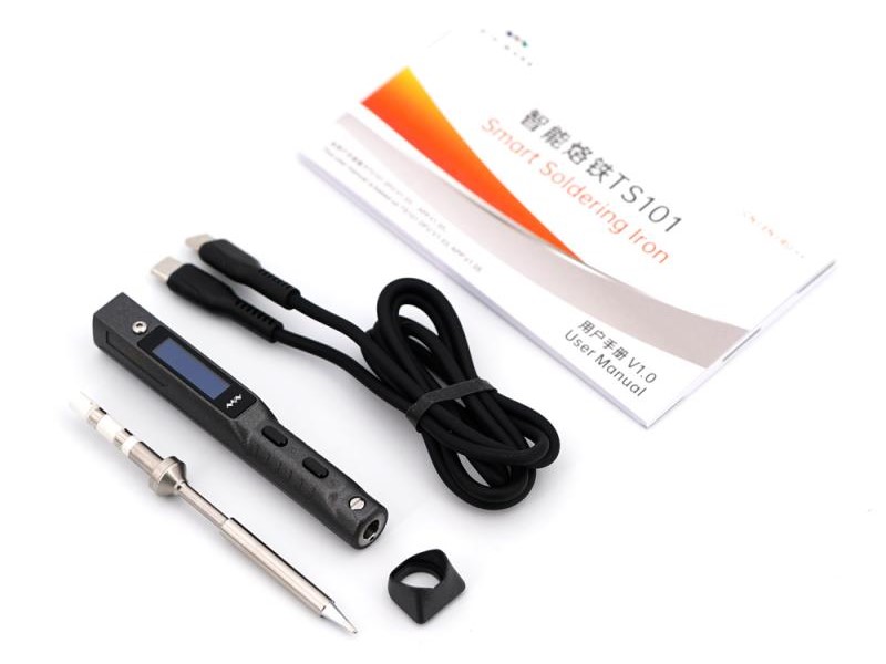 Der Lötkolben TS101 ist eine verbesserte Version des Lötkolbens TS100. Basierend auf dem TS100 wurde der TS101 in Leistung und Funktion optimiert, um das Benutzererlebnis zu verbessern. Der TS101-Controller hat ein robustes und ansprechendes Erscheinungsbild und verwendet einen grösseren OLED-Bildschirm mit 128×32 Pixeln, um mehr Heizdaten anzuzeigen. Die klassische A-B-Tasten-Bedienung setzt die TS100-Bedienungsgewohnheiten fort. Ein neues praktisches Zubehör – eine rutschfeste Kappe, kann nicht nur als einfacher Ständer verwendet werden, um das Eisen zu stützen und ein Wegrollen zu verhindern, sondern auch als rutschfeste Abdeckung für den Finger und zum Entfernen der Lötspitze.