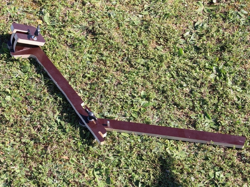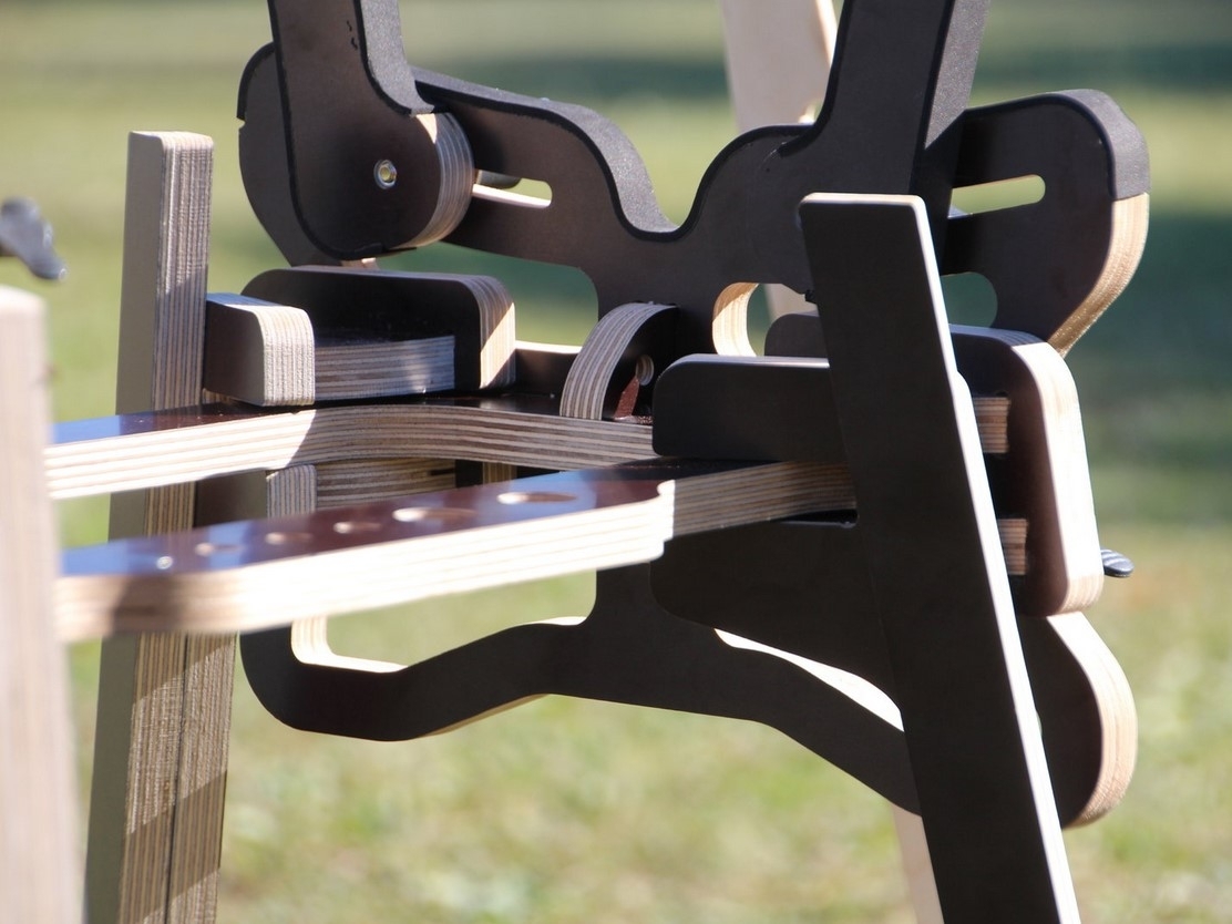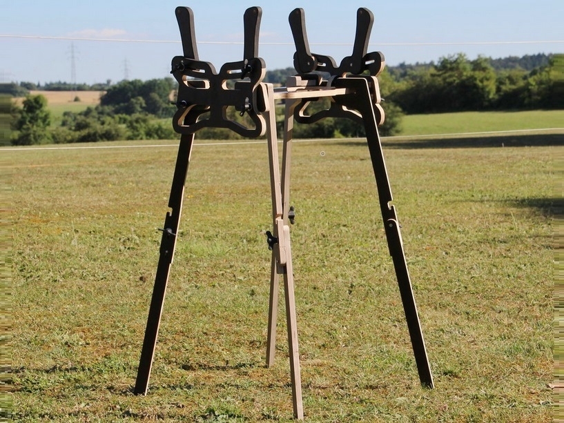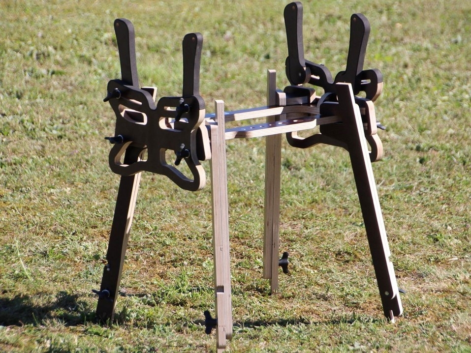 Die optionalen Füsse sind klappbar und können durch Lösen der Flügelschrauben einfach ein und ausgeklappt werden. Eine Arretierung wird jeweils durch einen 6 mm Passstift aus Edelstahl erreicht. In eingeklappten Zustand passt der aufgebaute Variostand mit Füssen auch ins Auto und wird am Modellplatz im Handumdrehen zur Aufbauhilfe in angenehmer Höhe.