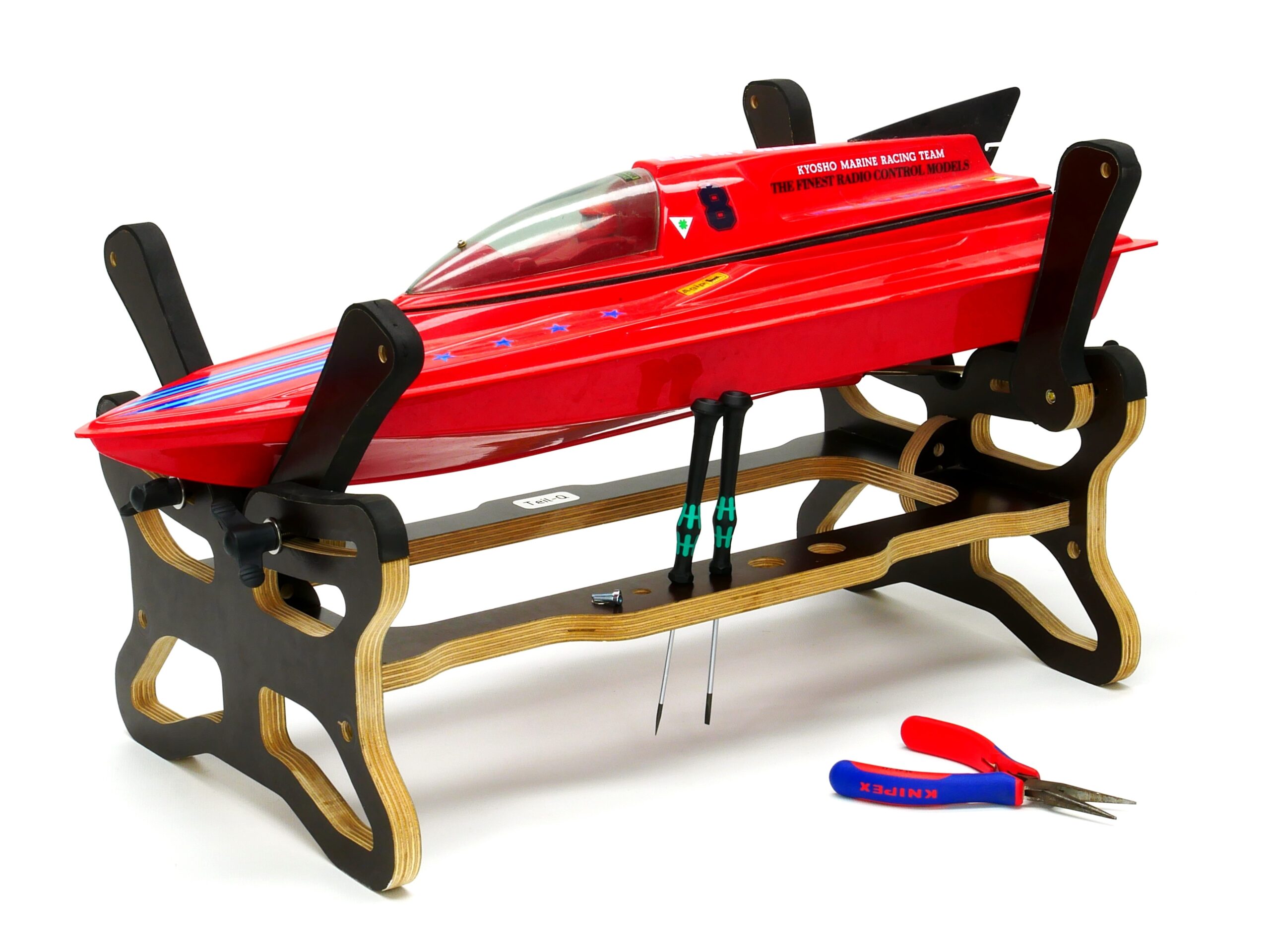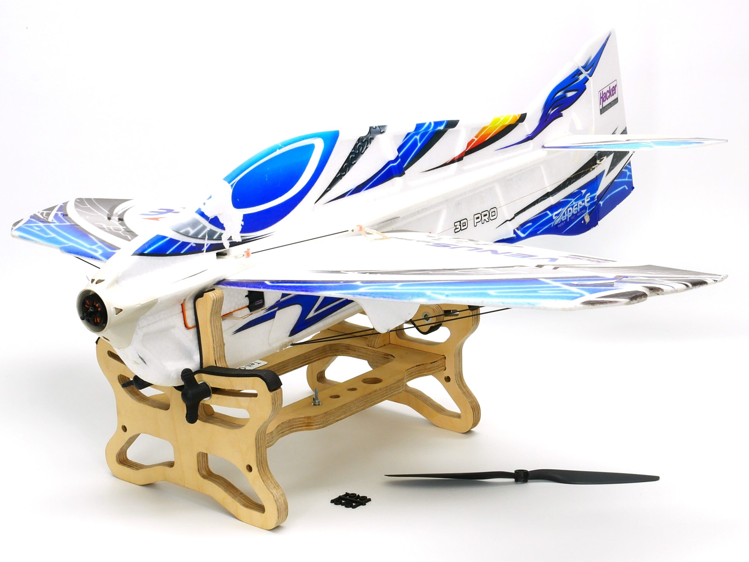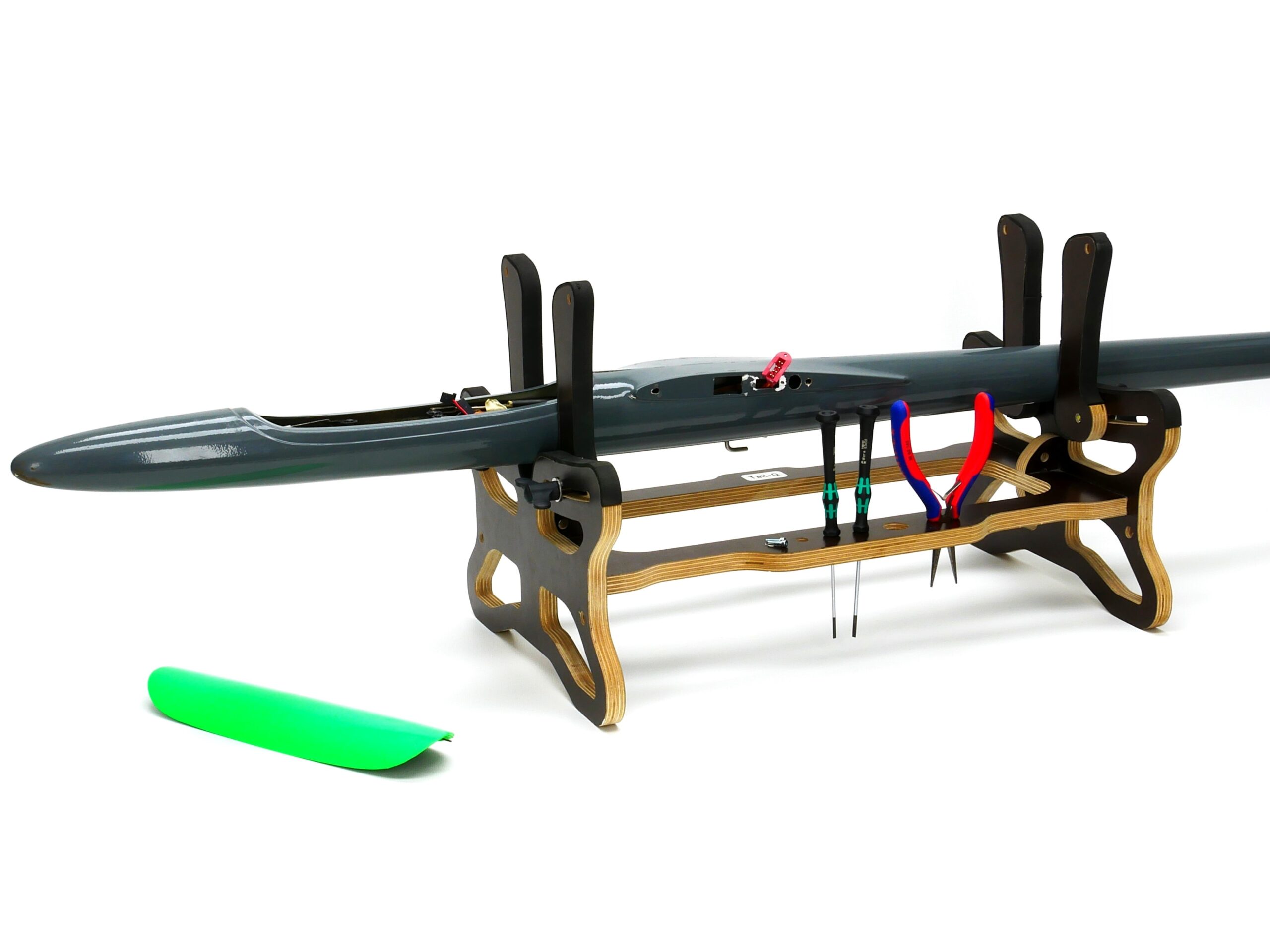 Die Holzteile sind CNC gefräst aus hochwertigen und stabilen 15mm Birkenmultiplex. Das Stecksystem macht den Modellbauständer zusätzlich stabil und er lässt sich einfach zusammenbauen. Die Holzteile werden mit 3mm Neoprengummi an den Auflagestellen beklebt, damit das Modell sicher gehalten und nicht beschädigt wird.