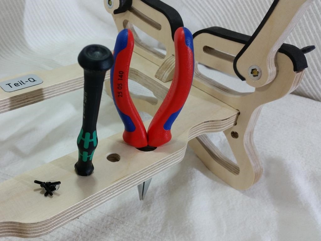Für die Anpassung an die verschiedenen Modelle sind Langlöcher vorgesehen. In den verstellbaren Ohren sind Gewindeeinsätze eingeschraubt. Um die Ohren zu fixieren, werden diese mit ergonomisch geformten Flügelschrauben mit Kunststoffgriff geklemmt. In die Bohrungen kann Werkzeug abgelegt werden. An den praktische Magnethalter können Kleinteile wie Schrauben oder Muttern angeheftet werden und verschwinden so nicht mehr auf der Werkbank.