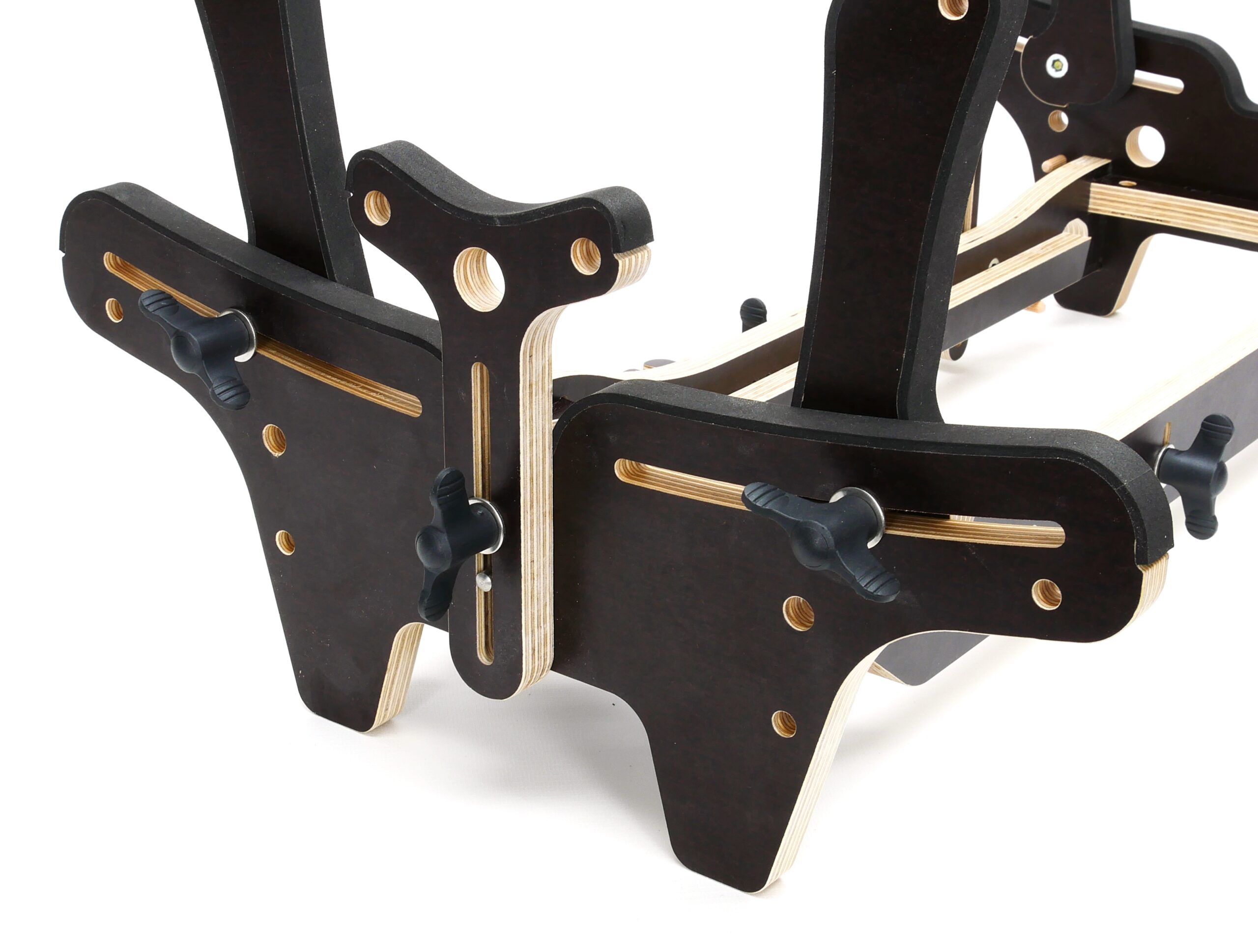 Die Holzteile sind CNC gefräst aus hochwertigen und stabilen 15mm Birkenmultiplex. Das Stecksystem macht den Modellbauständer zusätzlich stabil und er lässt sich dadurch einfach zusammenbauen. Die Holzteile werden mit 3mm selbstklebenden Gummi an den Auflagestellen beklebt, damit das Modell sicher gehalten und nicht beschädigt wird. Bei der Black Edition ist das Holz zusätzlich mit einer 240 g/m² dicken Phenolharzbeschichtung versehen, die den Modellständer besonders widerstandsfähig macht.