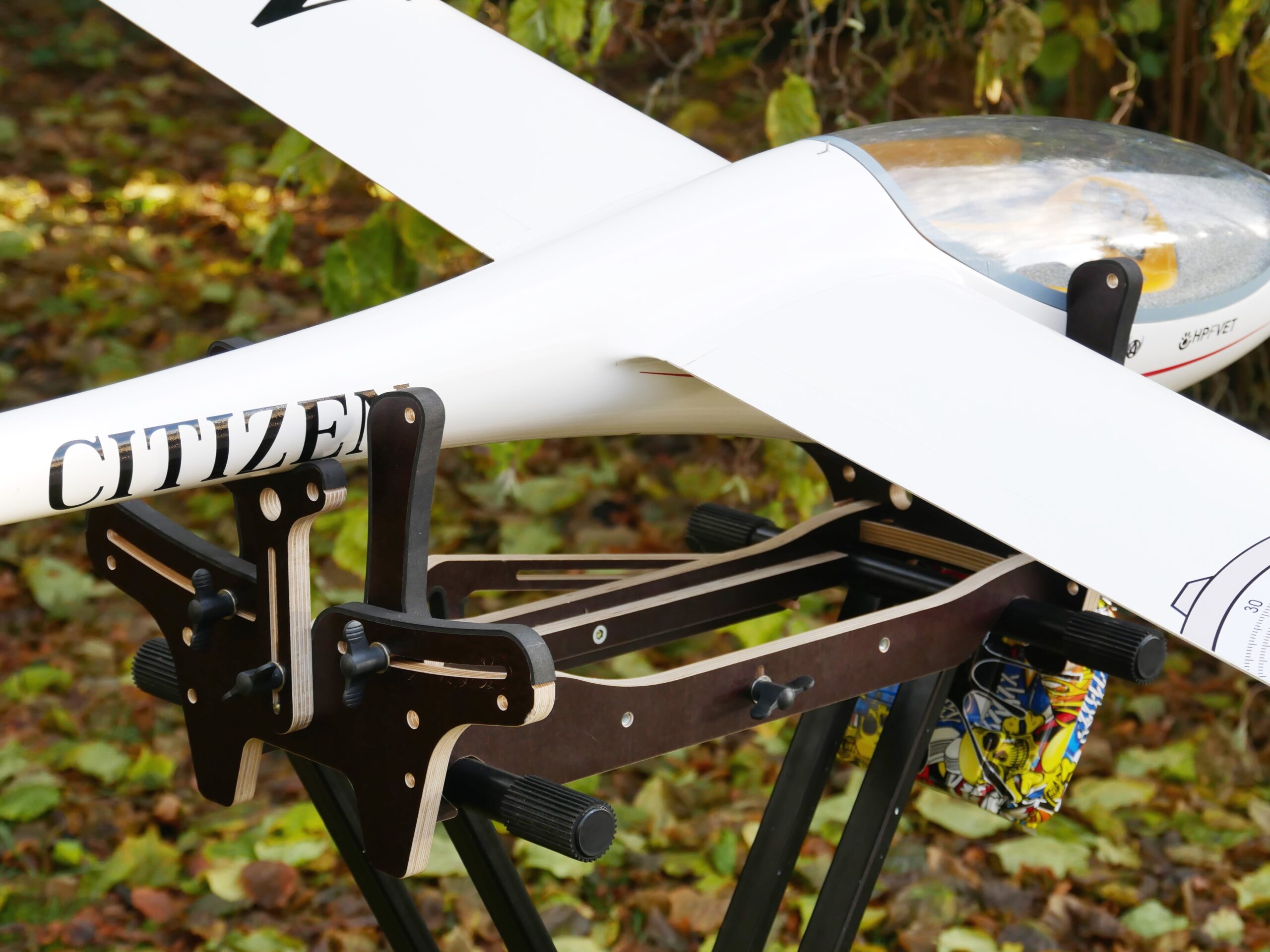 Bei der Konstruktion des WingFix sind alle Erfahrungen aus den bisherigen Produkten eingeflossen. In Verbindung mit einem Keyboardständer (28 – 30mm Rohrdurchmesser) wird er zur bequemen Montagehilfe auf dem Flugplatz. Um ein möglichst breites Einsatzspektrum zu erreichen, können die einstellbaren Ohren, die das Modell halten in einem weiten Bereich von 10mm bis 35cm eingestellt werden. Dafür sind Langlöcher vorgesehen. In den verstellbaren Ohren sind Gewindeeinsätze eingeschraubt. Um die Ohren zu fixieren, werden diese mit ergonomisch geformten Flügelschrauben mit Kunststoffgriff geklemmt.
