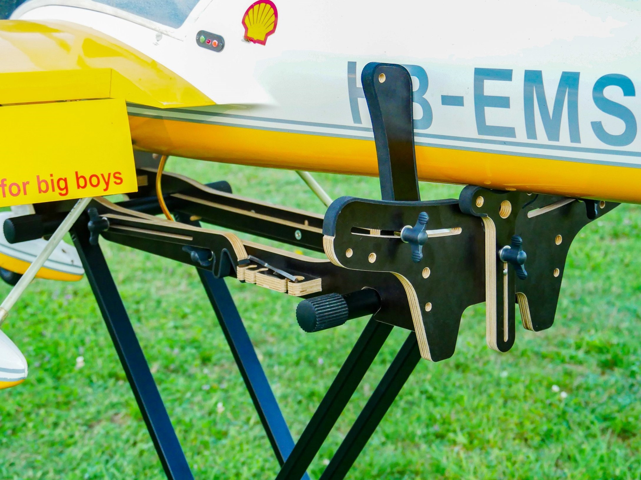 Bei der Konstruktion des WingFix sind alle Erfahrungen aus den bisherigen Produkten eingeflossen. In Verbindung mit einem Keyboardständer (28 – 30mm Rohrdurchmesser) wird er zur bequemen Montagehilfe auf dem Flugplatz. Um ein möglichst breites Einsatzspektrum zu erreichen, können die einstellbaren Ohren, die das Modell halten in einem weiten Bereich von 10mm bis 40cm eingestellt werden. Dafür sind Langlöcher vorgesehen. In den verstellbaren Ohren sind Gewindeeinsätze eingeschraubt. Um die Ohren zu fixieren, werden diese mit ergonomisch geformten Flügelschrauben mit Kunststoffgriff geklemmt.