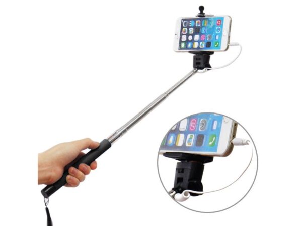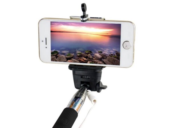 Selfie-Stick ausziebar von 23cm bis 115cm, mit Stativ-Schraubanschluss für fast alle Kameras und Zusatzadapter für Smartphones mit einer Breite von 50mm – 85mm. Die Software respektive der Selfie-Stick ist kompatibel mit Android * und IOS Phones.