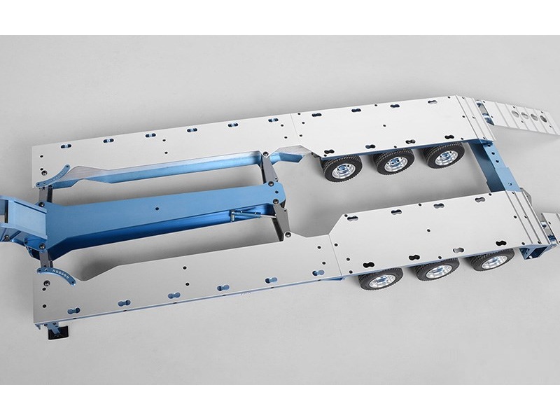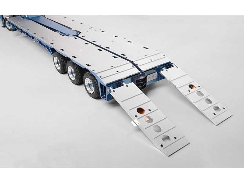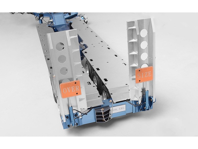 Nutzen Sie diesen Tieflader um Ihre Baumaschinenmodelle oder ähnliche überdimensionierte Lasten zu transportieren. Die Ladefläche des Swingwing-Aufliegers ist manuell in der Breite verstellbar. Die Auffahrrampen lassen sich herunterklappen. Der Swingwing liegt auf einem Dolly-Auflieger, welcher wie beim Vorbild die Last besser auf die Fahrbahnoberfläche verteilt und auch die Wendigkeit des Sattelzuges erhöht.