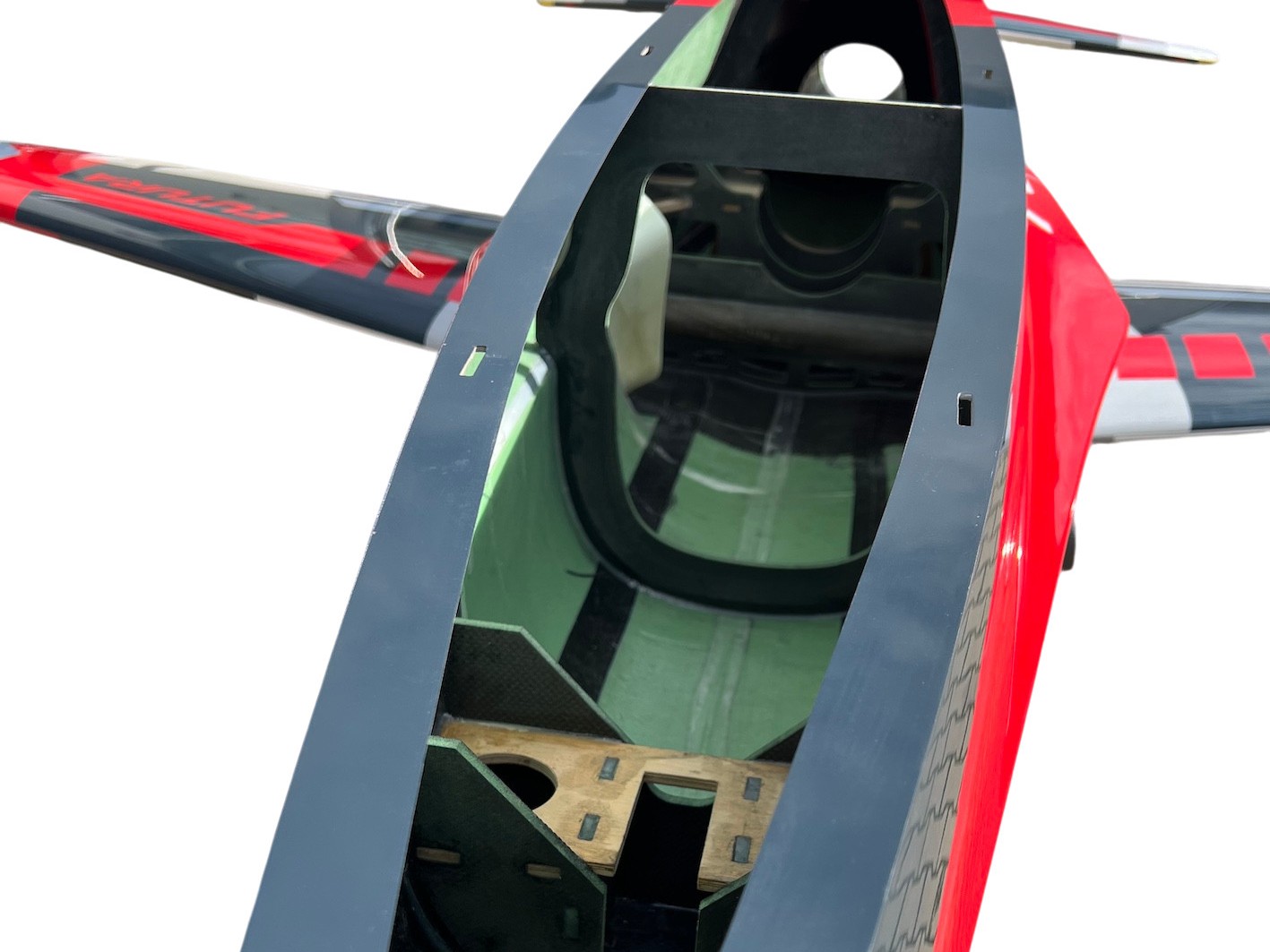 Die Struktur der Futura V3 basiert auf einem konsequenten Leichtbaukonzept. Die Spanten sind aus hochwertigem Airex gefertigt und zusätzlich mit CFK verstärkt, um den Belastungen im dynamischen Kunstflug standzuhalten. Sämtliche Steckungen für Flächen und Leitwerke bestehen aus Kohlefaser, was nicht nur Gewicht spart, sondern auch für maximale Steifigkeit sorgt. Die Fahrwerks- und Turbinenaufnahmen sind aus mehrfach verleimtem Holz gefertigt, um die nötige Robustheit für den harten Flugalltag zu gewährleisten.