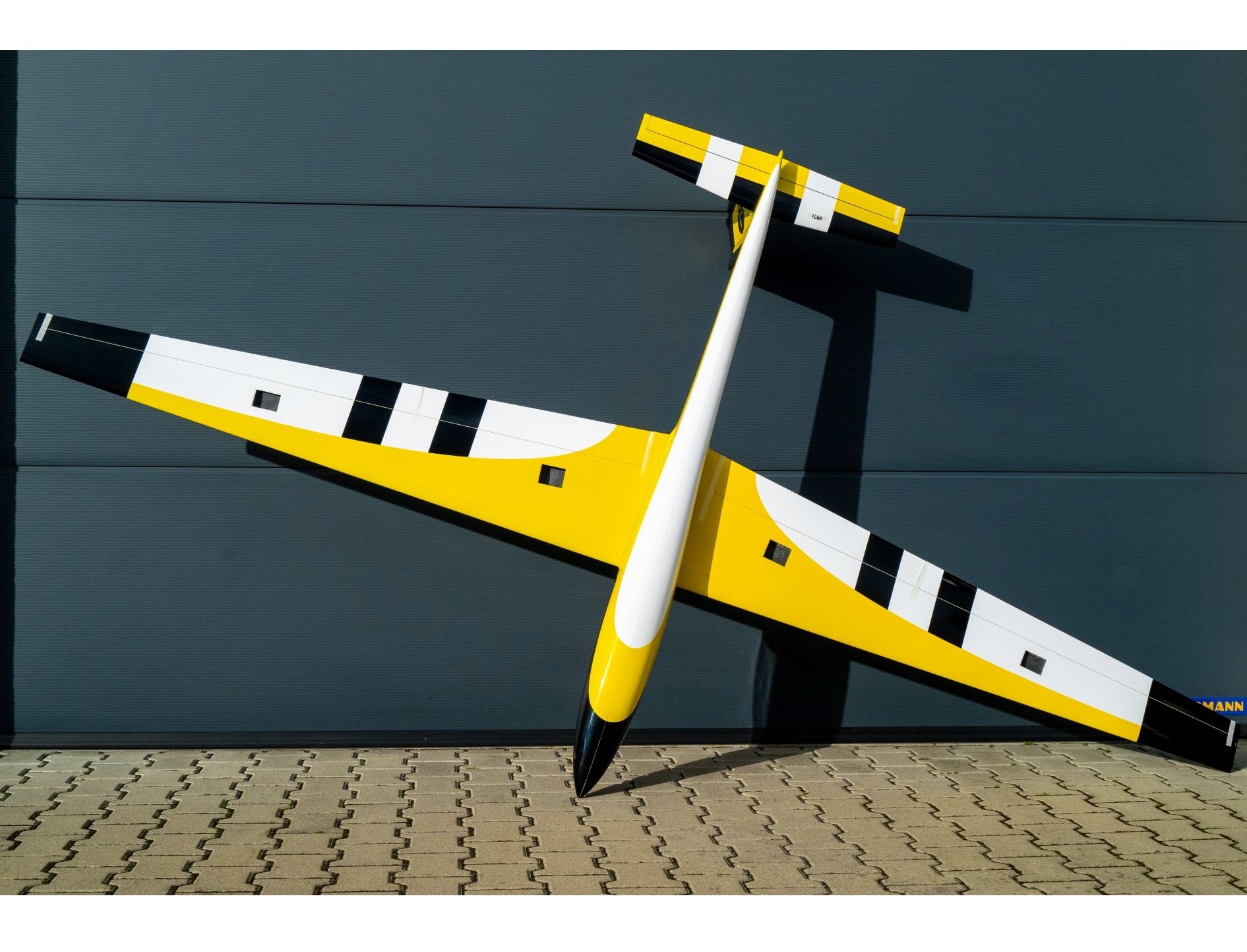 Das Modell wurde am CAD von einem Aerodynamiker neu konstruiert, dementsprechend ist die Flächengeometrie und das Flächenprofil aerodynamisch berechnet worden und stellt das Optimum für dieses Modell dar. Der Rumpf ist in Voll-Composite Bauweise aus GFK mit Kohlefaser Verstärkungen aufgebaut , die Flächensteckung ist ein Rechteck-Kohlefaser Verbinder. Die Tragflächen sind in aufwändiger Voll-CFK-Composite-Sandwich Schalenbauweise hergestellt und für eine perfekte Oberfläche wird als erste Decklage ein feines 50g/qm Glasgewebe verwendet. Alle Teile sind in der Form mehrfarbig im entsprechende Design lackiert ( hier gelb/schwarz , siehe Grafik . Die Bilder sind vom Demo-Modell)