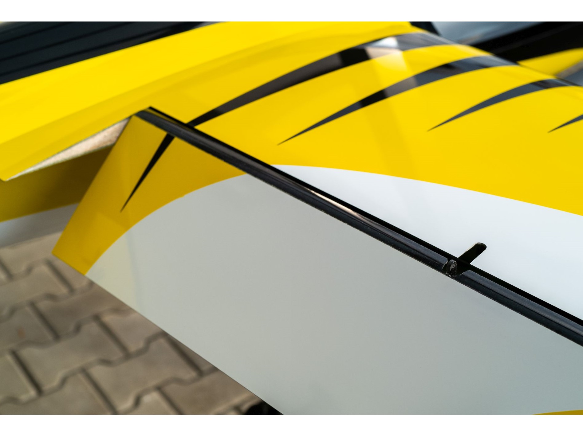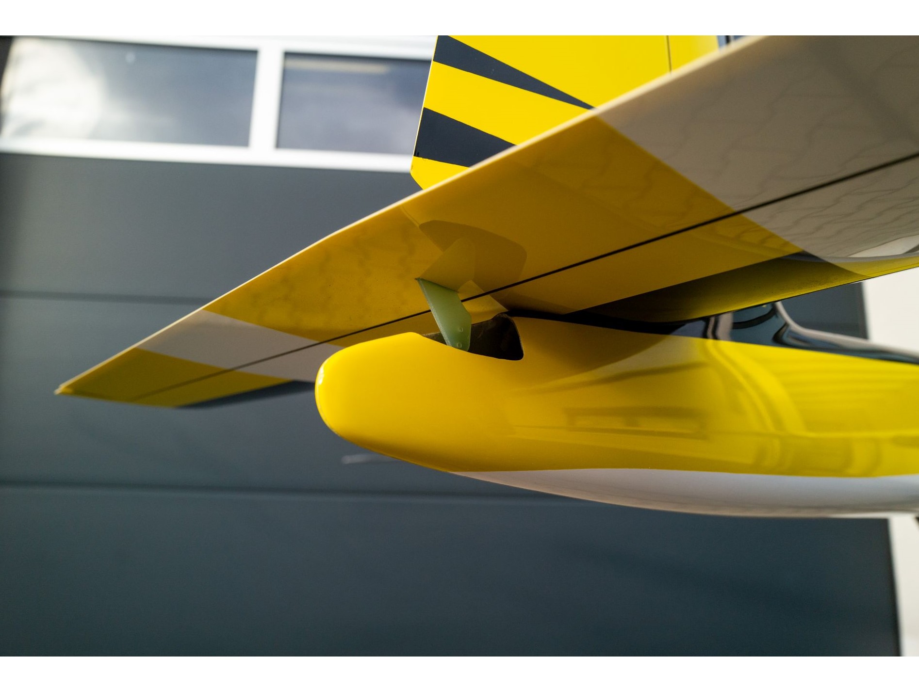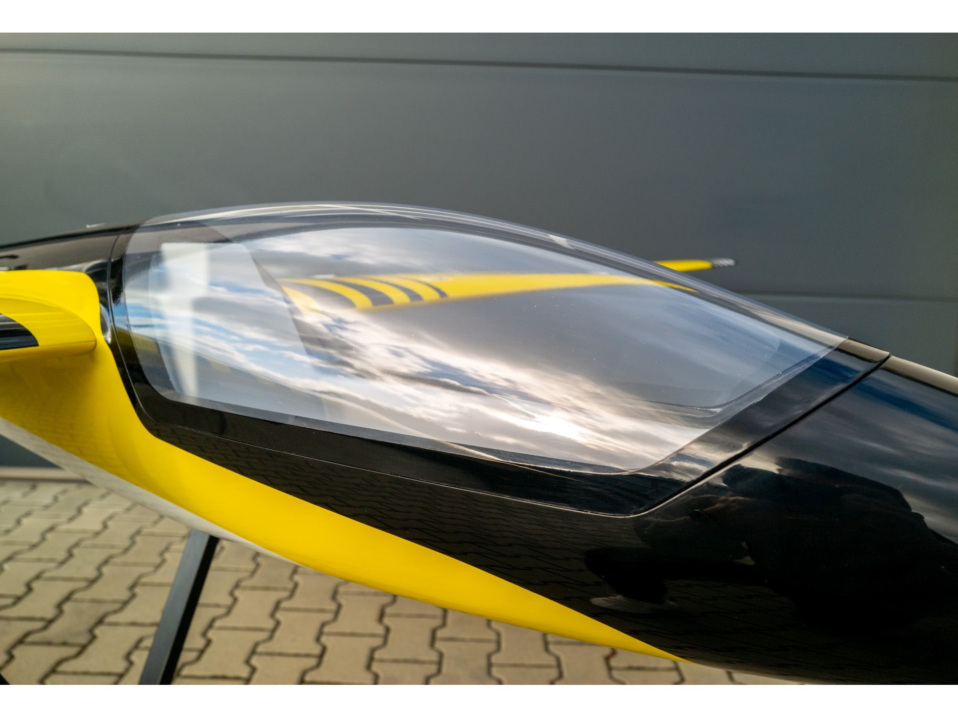 Das Modell wurde am CAD von einem Aerodynamiker neu konstruiert, dementsprechend ist die Flächengeometrie und das Flächenprofil aerodynamisch berechnet worden und stellt das Optimum für dieses Modell dar. Der Rumpf ist in Voll-Composite Bauweise aus GFK mit Kohlefaser Verstärkungen aufgebaut , die Flächensteckung ist ein Rechteck-Kohlefaser Verbinder. Die Tragflächen sind in aufwändiger Voll-CFK-Composite-Sandwich Schalenbauweise hergestellt und für eine perfekte Oberfläche wird als erste Decklage ein feines 50g/qm Glasgewebe verwendet. Alle Teile sind in der Form mehrfarbig im entsprechende Design lackiert ( hier gelb/schwarz , siehe Grafik . Die Bilder sind vom Demo-Modell)