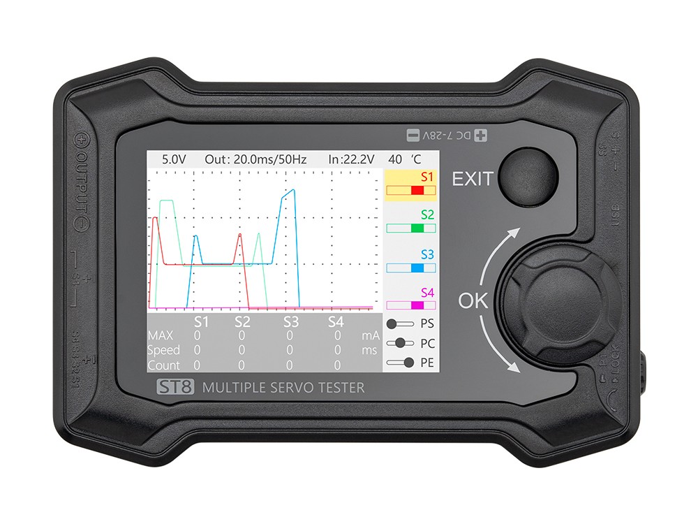 Der ST8 unterstützt PWM-, PPM- und SBUS-Signale sowohl im Eingangs- als auch im Ausgangsbetrieb und eignet sich damit ideal für die Prüfung von Servos, Empfängern und Steuerungen in RC-Modellen. Vier Servokanäle (S1-S4) können individuell überwacht werden, während bis zu acht Kanäle simultan gesteuert werden können.