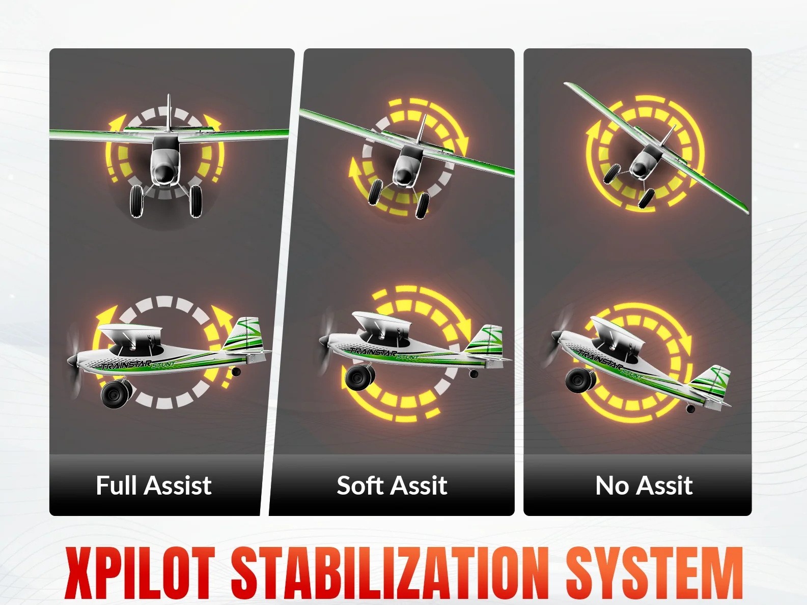 Der Trainstar Stunt von Volantex ist ein ferngesteuertes RC Flugmodell, das aufgrund seiner technischen Ausstattung für den Einstieg in den Modellflug konzipiert ist. Das Modell verfügt über das Xpilot Stabilisierungssystem mit 6-Achs-Gyro, welches das Flugverhalten in drei verschiedenen Stufen (Full Assist, Soft Assist, No Assist) stabilisiert. Ein Brushless-Antrieb sorgt in Kombination mit einem Getriebesystem für eine effiziente Kraftübertragung und erhöht die Flugzeit auf bis zu 20 Minuten pro Akkuladung. Über eine spezielle Taste am Sender können automatisierte Flugmanöver eingeleitet werden.
