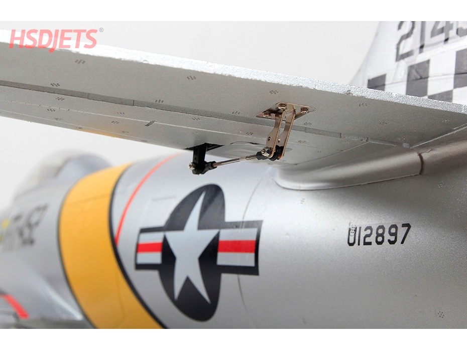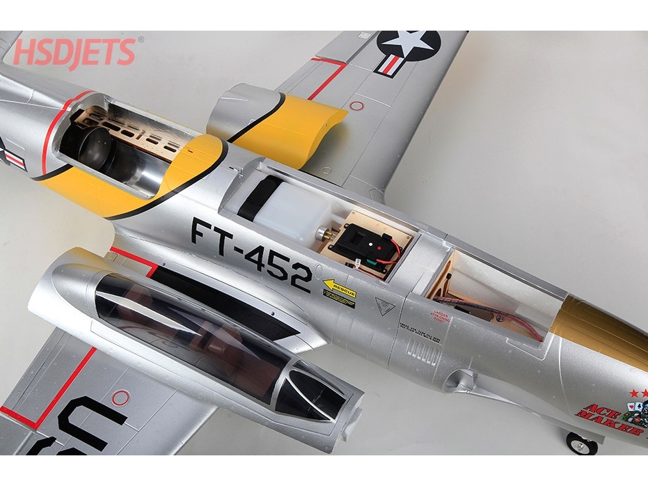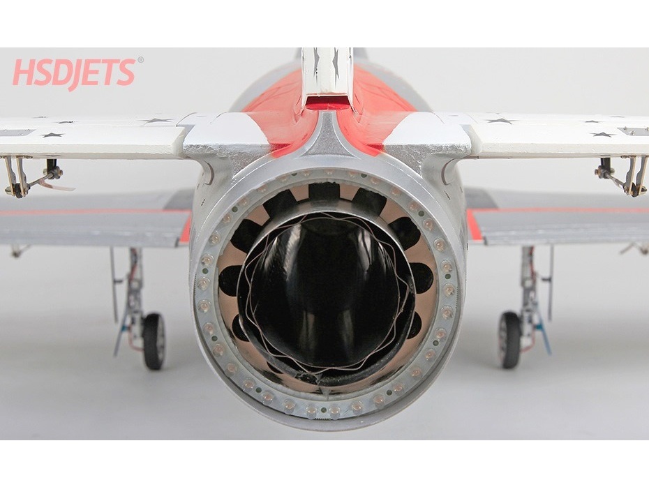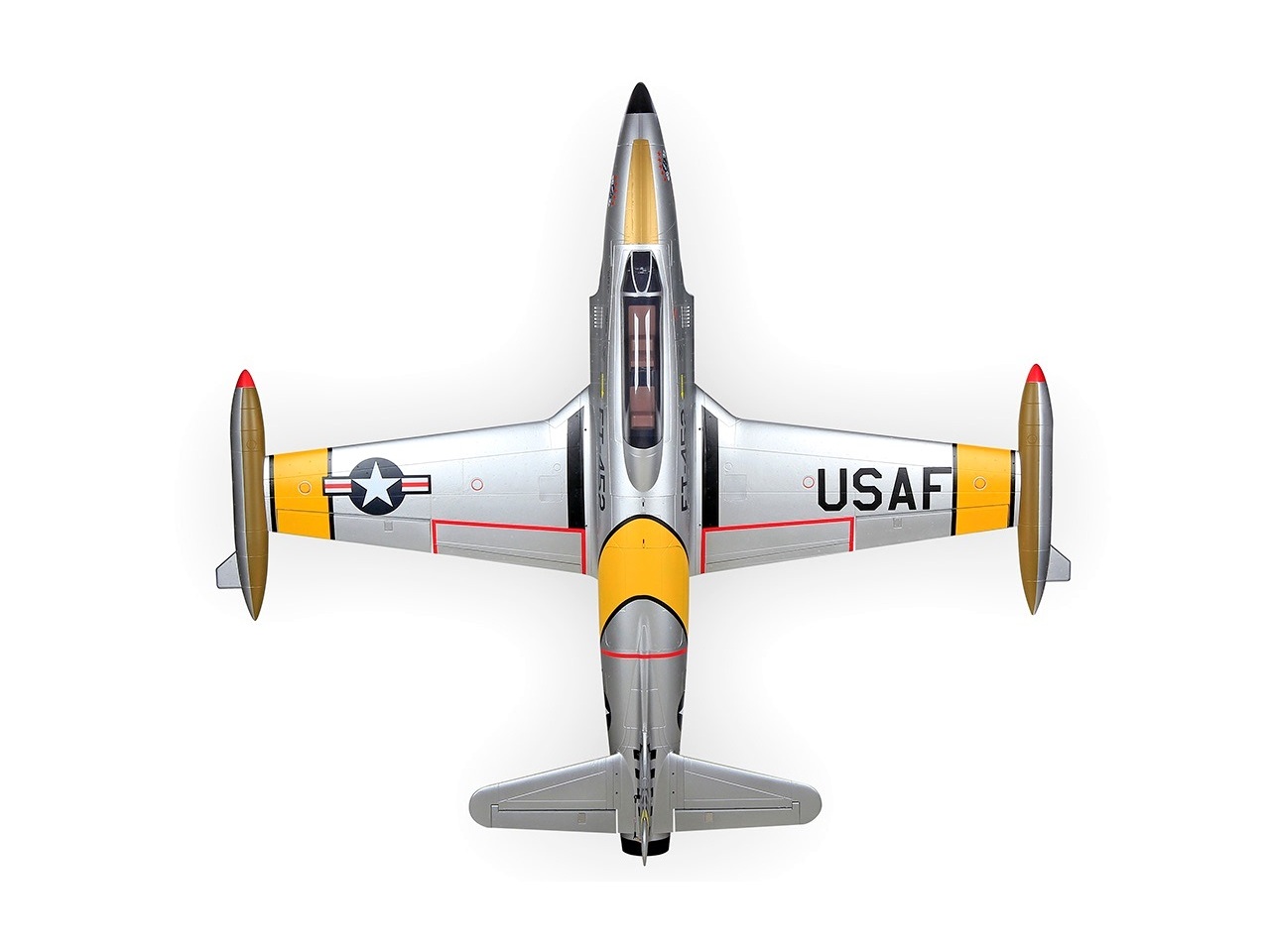 Das Modell ist weitgehend vorgefertigt und innert kurzer Zeit bereits flugfertig. Die T33 verfügt über funktionsfähige Landeklappen, ein gefedertes, elektrisches Aluminium-Einziehfahrwerk mit elektrischer Bremse, Scale-Beleuchtung, Aterburner-LED-Ring (mit Gas gekoppelt) usw.. Alle Komponenten wie das gefederte Fahrwerk, Tanks, Schubrohr, Digital-Servos, u.s.w, sind bereits eingebaut. Zum Betrieb fehlt nur noch eine Turbine mit ca. 6kg Schub, sowie Sender/Empfänger und Empfänger-Akkus.