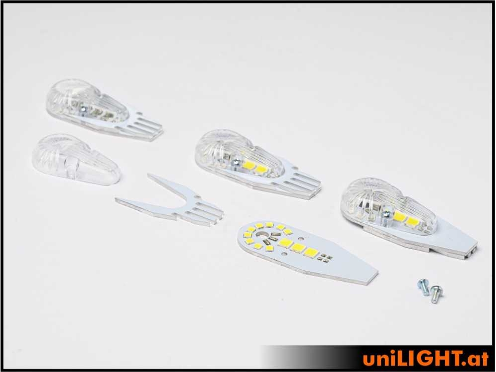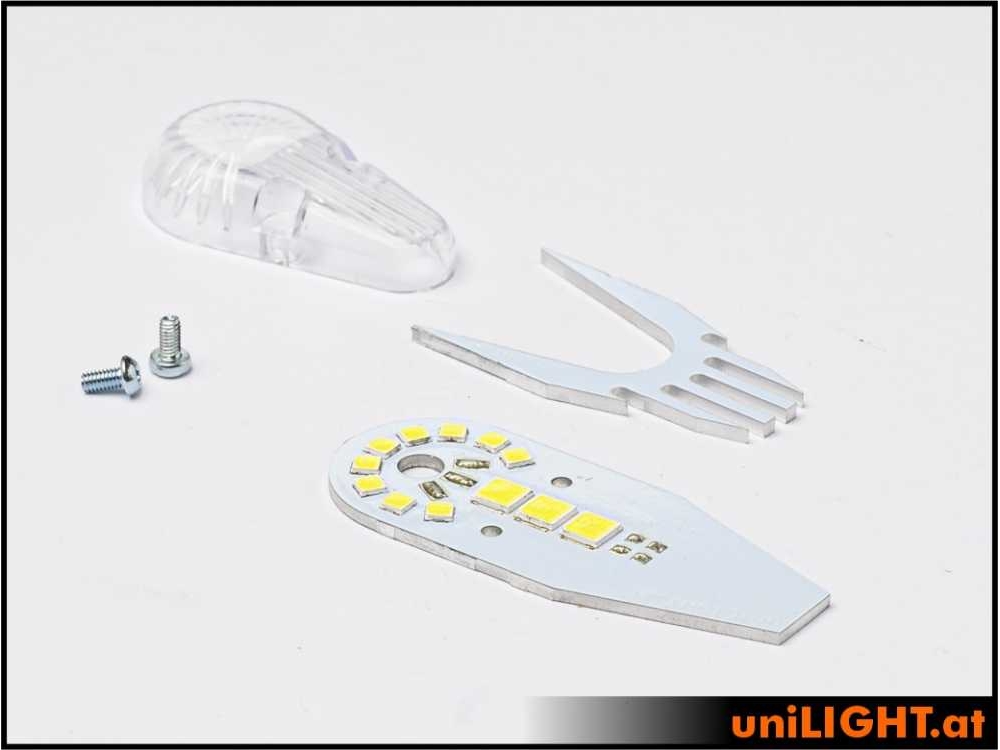 Sehr leistungsstarkes, kombinierters Positions- und Blitzlicht in der 24mm Bauform. Das Licht passt auf größere Modelle ab zirka 2.5m Spannweite und enthält ein Positionslicht und ein Blitzlicht in x2-Technik. Beide Lichter werden einzeln angesteuert, die Lampe hat daher drei Leitungen, einen gemeinsamen Pluspol. Die integrierte Temperatursicherung überwacht permanent den Betrieb und schaltete das Licht bei Überlast ab und nach dem Abkühlen wieder ein. Die tropfenförmige polycarbonat Kappe wird aufgeschraubt und kann auch separat lackiert werden, ist hochtransparent und bruchfest. Der beiligende Zusatzkühlkörper muss innen oder außen an der Lampe verklebt werden.