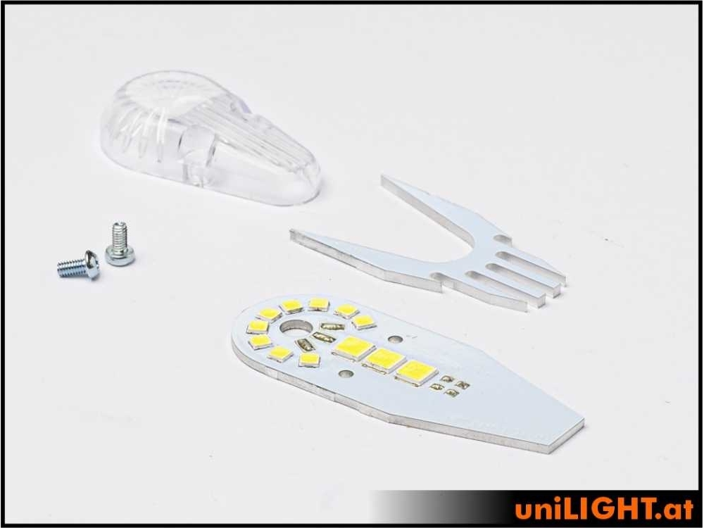 Leistungsstarkes Positions-/Navigationslicht in x2 Technik – verdoppelte Lichtleistung und gleiche Abwärme! Das Profillicht der 24mm Serie passt auf größere Modelle ab zirka 2.5m Spannweite. Die profilförmige Polycarbonat Kappe wird aufgeschraubt und kann auch separat lackiert werden, ist hochtransparent und bruchfest. Der beiligende Zusatzkühlkörper kann innen oder außen an der Lampe verklebt werden.