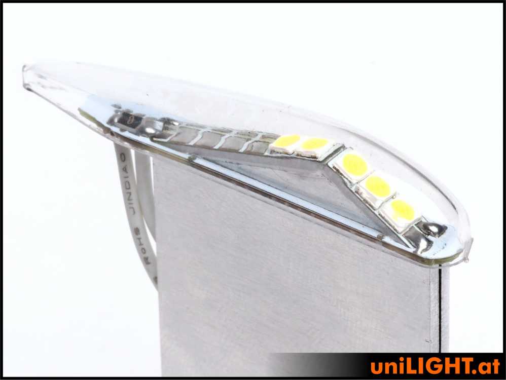 Die extrem schmale Bauform läßt sich auch in sehr dünnen Randbögen von Jets, Sportmaschinen und Seglern integrieren. Zum Lieferumfang gehört eine hochtransparent und extrem bruchfeste Abdeckkappe aus gespritzem Polycarbonat. Die Kappe muss am Modell mit dem Lichtmodul verklebt werden.