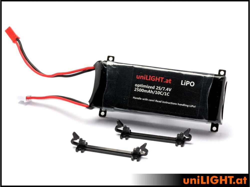 LiPo Batterie mit der perfekten Kapazität, Größe und Gewicht für den schnellen Betrieb eines uniLIGHT Lichtsystems. Das Batteriepack hat ein passendes Anschlusskabel und ist auf einer Glasfaserplatte montiert, passend zu den beiliegenden Montageklammern der BLACK-Serie. Über den Balanceranschluss und unser Ladekabel ist eine einfache und schnelle Akkupflege möglich.