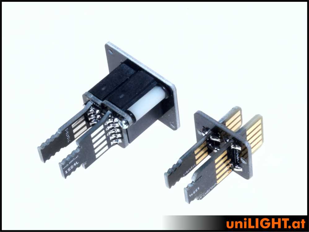 Das neuartige Stecksystem uniCONNECT arbeitet mit massiven Messer- und hoch belastbaren Sockelleisten. Durch die neue Bauform können nun endlich auch hohe Polzahlen in einem Stecker bei geringer Baugröße realisiert werden – aktuell bis zu 22 Pins. Dazu werden über 3000 Steckzyklen bei Belastungen bis 10A möglich. Optimal für den Einsatz mit Modellbau realisiert.