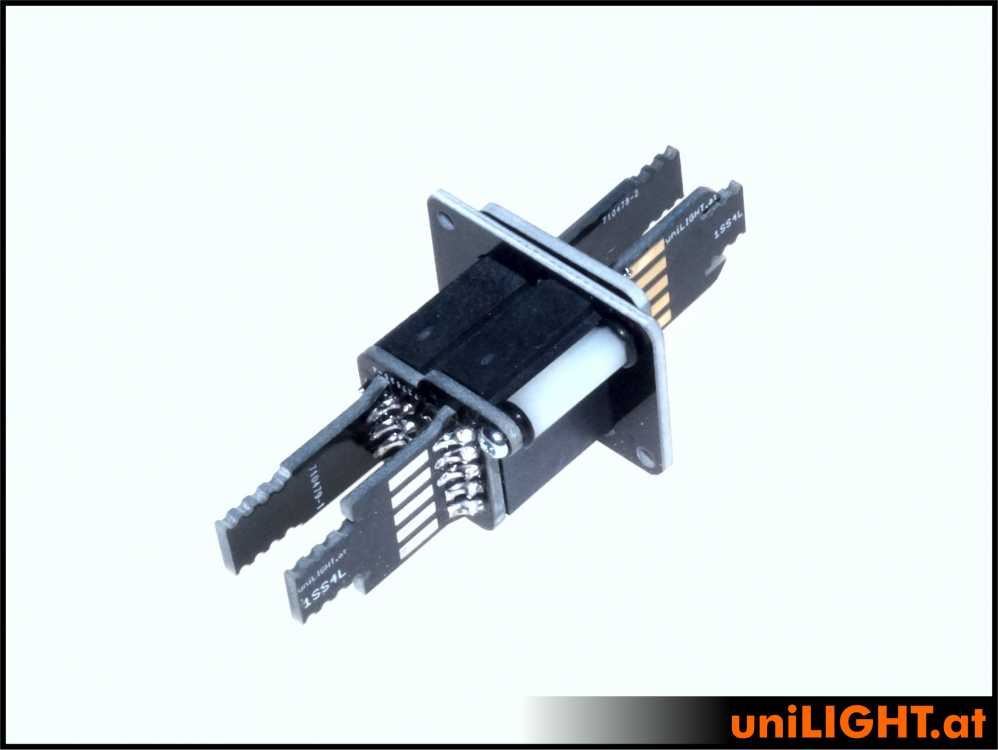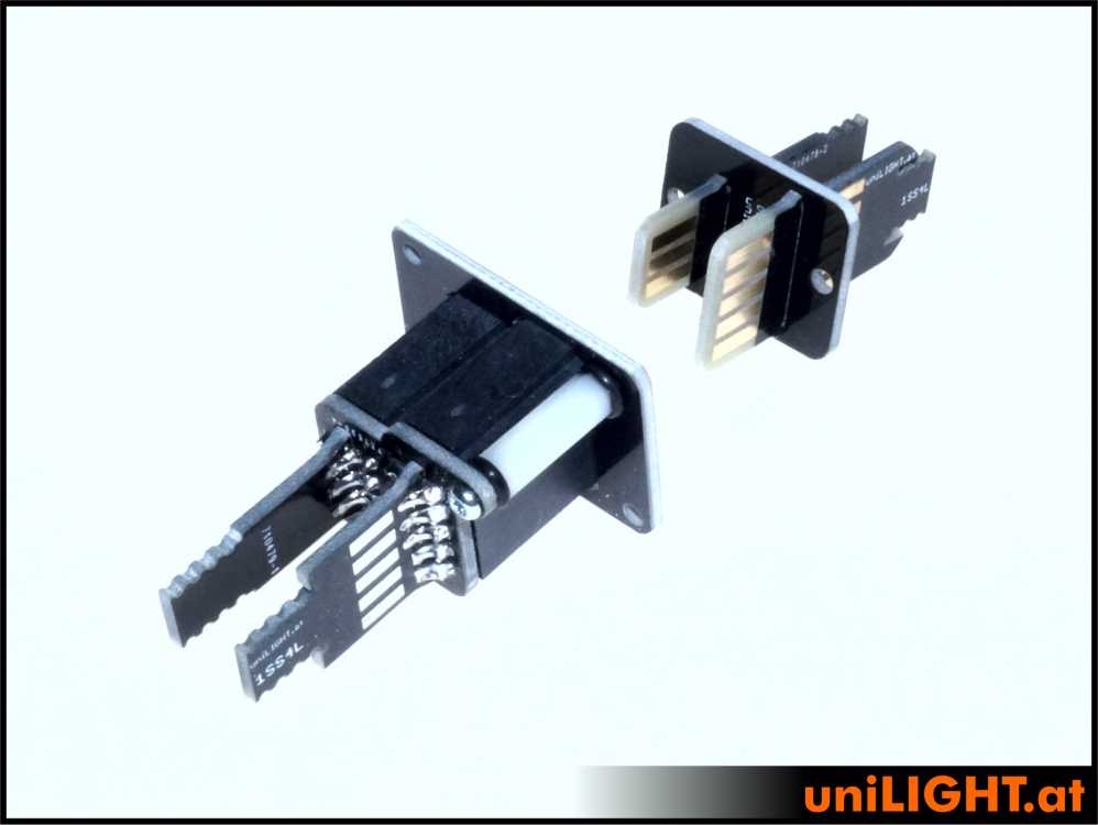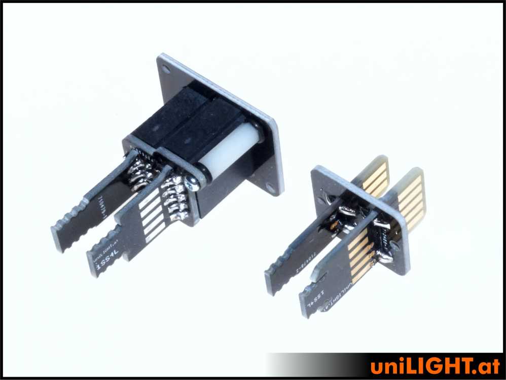Floating DIRECT & Floating HEADER sind zwei Gruppen von Stecksystemen, die ausschließlich für die selbstständige Kontaktierung von Flügel und Rumpf entwickelt wurden. Es hängen keine Kabel und Stecker herum, die beschädigt oder verschmutzt werden können. Die Messerleiste wird beim Zusammenbau direkt mit der Buchse kontaktiert. Dies ist bei uniCONNECT zuverlässig möglich, weil die Buchsenleisten nicht starr sondern „floating“ mit dem Träger verbunden sind und sich daher bei leichten Bewegungen und Vibrationen der Flügel mit bewegen können. Natürlich ist das System nur für starr verschraubte, rechtwinkelige und sauber geführe Verbindungen geeignet. Die Stecker können keine mechanische Belastung von einer ungenauen Stecker aufnehmen!