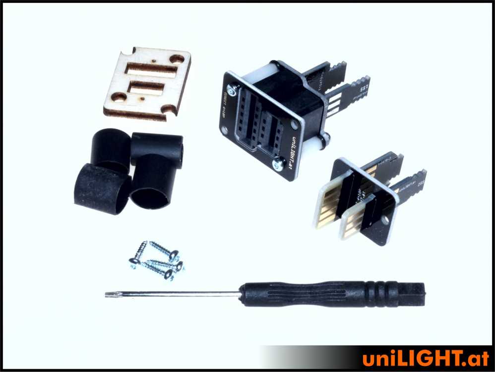Das neuartige Stecksystem uniCONNECT arbeitet mit massiven Messer- und hoch belastbaren Sockelleisten. Durch die neue Bauform können nun endlich auch hohe Polzahlen in einem Stecker bei geringer Baugröße realisiert werden – aktuell bis zu 22 Pins. Dazu werden über 3000 Steckzyklen bei Belastungen bis 10A möglich. Optimal für den Einsatz mit Modellbau realisiert.