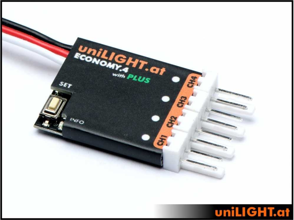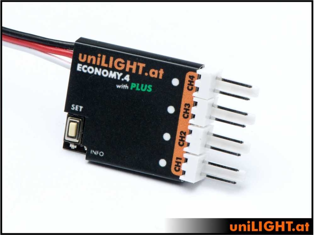 Die ECONOMY.4 ist der kleine Bruder der BLACK.4 Steuerung. Sie wurde in einigen Bereichen auf das Wesentliche reduziert um einfache und günstige Lichtsysteme für kleinere und mittlere Modelle zu realisieren. Sie ist wesentlich kleiner und leichter, kann aber auch nur für kleinere Leistungen genutzt werden und verzichtet auf Schutzfunktionen zugunsten der Wirtschaftlichkeit.