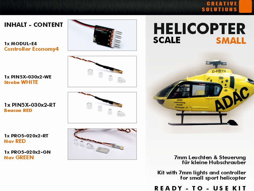 Beleuchtungsset für kleine Helikopter in einer Rumpfzelle, 450er bis zirka 600er Grösse. Das Set besteht aus zwei kurzen 5mm Positionlichtern in ROT und GRÜN, einem einfachen Blitzlicht, einem 5mm roten Beacon Licht und einer 4-Kanal Steuerung.