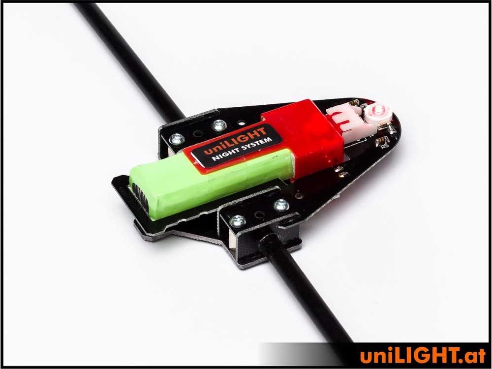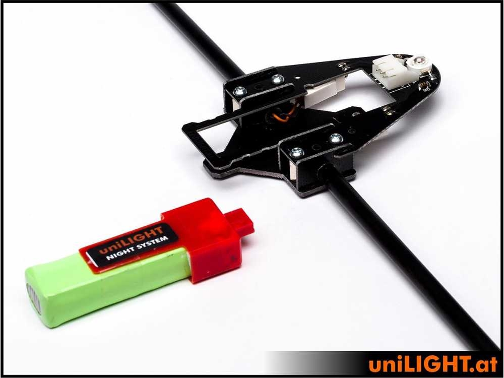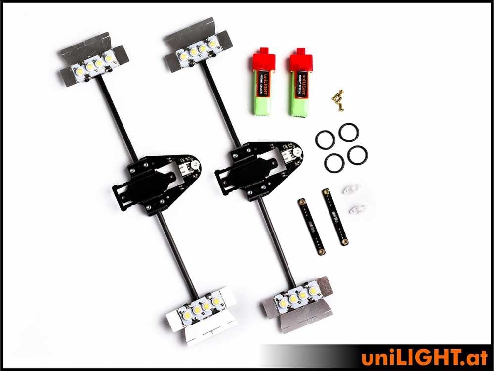 Im Vergleich zu den kabelgebundenen Systemen ist die Lichtleistung bei den leichten Akku Systemen etwas geringer, dafür ist das System sofort betriebsbereit und es müssen keine Kabel und Lötarbeiten an der Fläche durchgeführt werden. Im Auslieferungszustand sind die Rohre und Platten nur vormontiert und können am Modell noch gekürzt und ausgerichtet werden. Damit ist eine optimale Ausleuchtung erreichbar. Erst dann werden die Arme mit einigen Tropfen Epoxy endgültig fixiert. Auch eine unsymmetrische Montage ist möglich (kurzer Arm in Bodennähe).