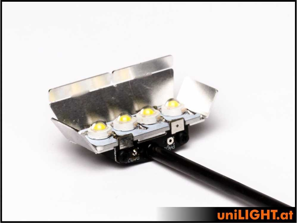 Dann werden Reflektorflächen werden einmalig so gebogen, dass der größt möglichte Teil der Lichtemission auf das Modell gelenkt wird. ACHTUNG: die Reflektorflächen verhärten sich und können nur wenige male gebogen werden. Fixieren Sie die verklebte Fläche bevor Sie die Flächen mit der Hand oder einen kleine Zangen ausrichten um ein Aufbrechen der Klebestelle zu verhindern.