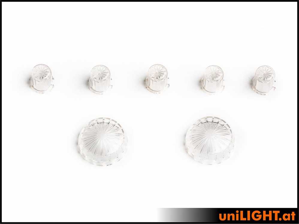 Ein Set aus 5 kleinen 10mm und 2 großen 24mm, runden Lichtkappen zum Eigenbau von Leuchten und Abdecken von einfachen Leuchtmitteln auf Ihrem Modell. Die Kappen sind nicht tiefgezogen, sondern aus hochwertigem Ploycarbonat gespritzt, schlag-/bruchfest sowie lackierbar.