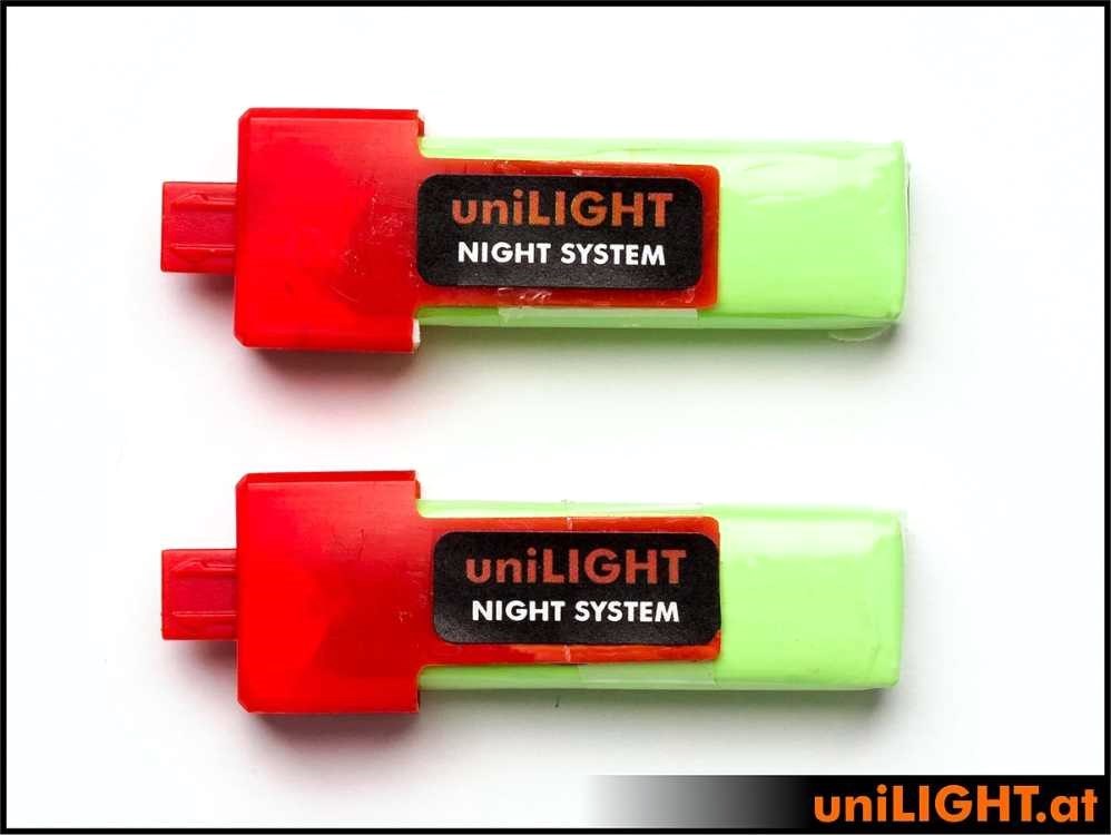 Doppelpack steckbare LiPo Akkus für die uniLIGHT Nachtflugsysteme. Inklusive passender Gummiringe zur Sicherung in der Halterung.
