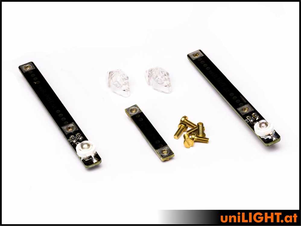 Satz für die einfache Montage und Kontaktierung des MEDIUM DIY-Set. Das Set beinhaltet Sicherheits-Montageplatten, bei denen zusätzlich zu den mechanischen Aufnahmen ein zweiter Stromkreis mit einem roten und einem grünen Begrenzungslicht enthalten ist. Somit bleibt im Fall eines Defektes immer noch die fundamentelle Lageerkennung erhalten, ein neuartiges Sicherheitsfeature für den Nachtflug!