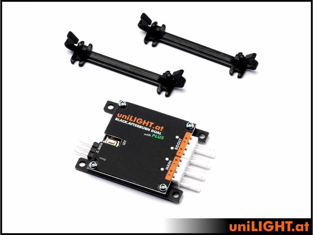 Die Nachbrenner Steuerung BLACK.AB2PLUS unterstützt bis zu zwei extrem leistungsstarke Nachbrennerringe, verwendbar für 2-strahlige Flugzeuge oder als Doppelring für höchste Lichtleistung. Neben dem typtischen „Flacker“ Effekt kann die Steuerung jetzt auch sanfte Glühfunktionen. Die Ansteuerung erfolgt wie bei allen uniLIGHT Steuerungen über den Servoweg, bzw. über Teile von diesem. Jetzt ist aber auch ein Schaltpunktbetrieb möglich, bei dem der Anschluss parallel zum Gas-Kanal möglich wird.