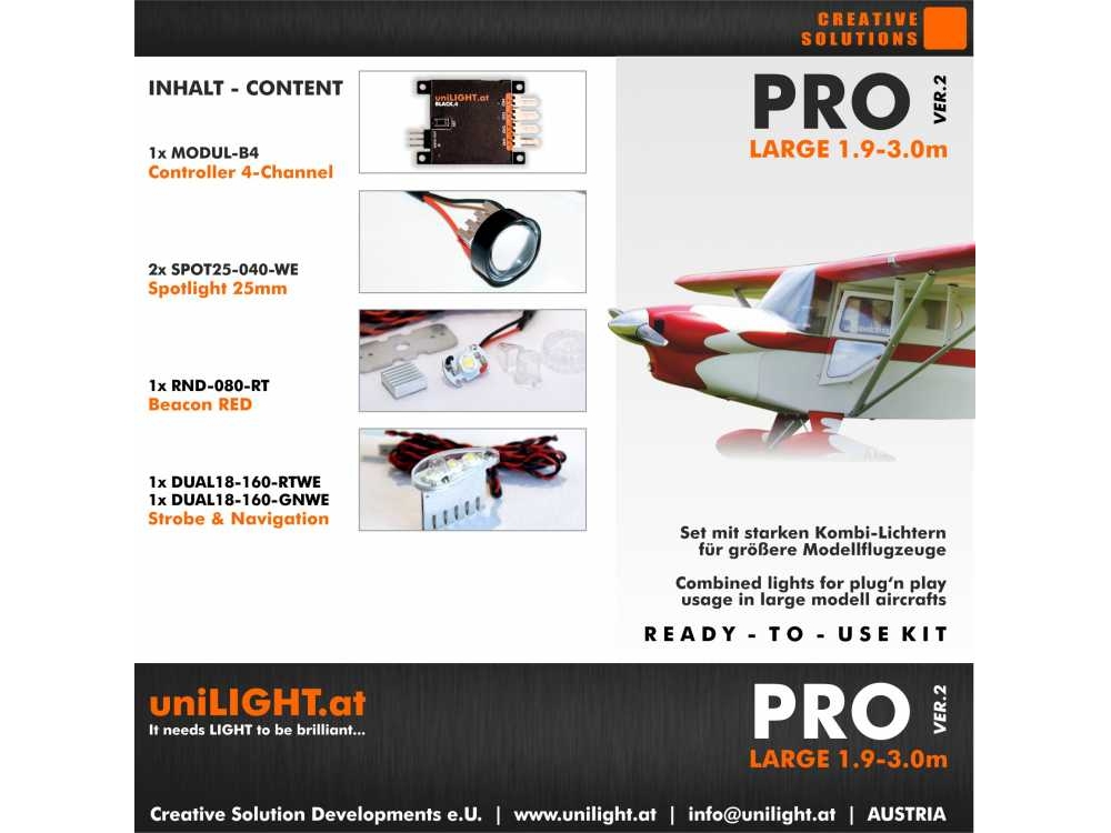 Das Set ist geeignet für Modelle ab zirka 1.9 bis 3mm Spannweite für Flugzeuge mit dickeren Flügeln. Das System wird direkt mit 2S Lipo betrieben. Alle Leuchten sind direkt betriebsfertig und brauchen nur am Steuermodul angeschlossen werden. Die Arbeit für den Modellbauer beschränkt sich auf das Verlegen bzw. Verlängern der Kabel. Das Set kann natürlich beliebig mit den einzeln erhältlichen Komponenten erweitert werden.