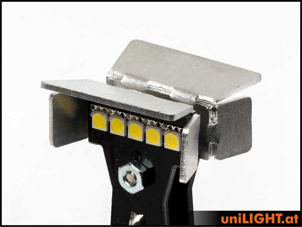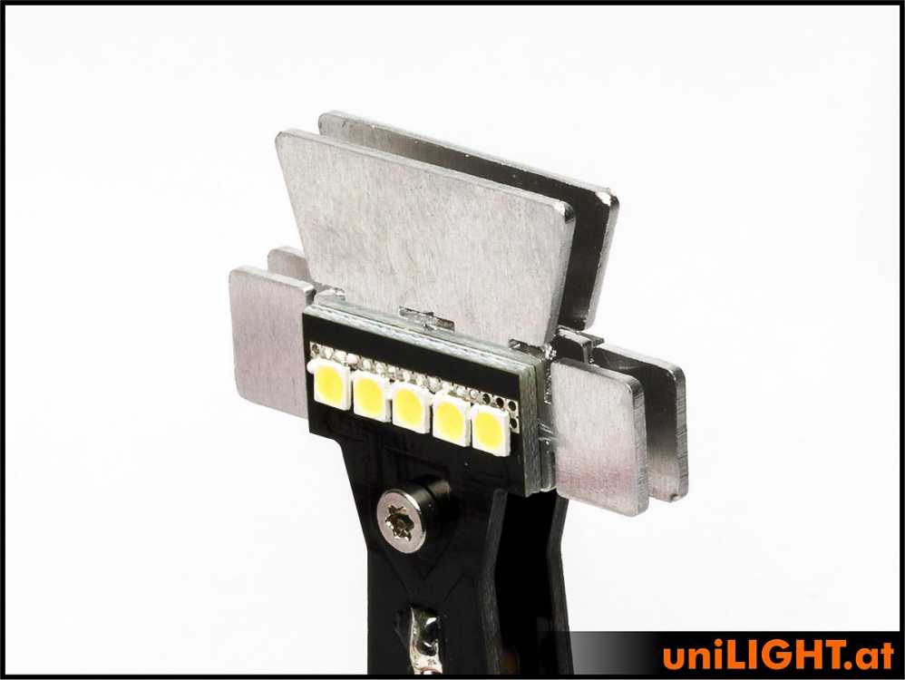 Die Reflektorflächen werden einmalig so gebogen, dass der größt möglichte Teil der Lichtemission auf das Modell gelenkt wird. ACHTUNG: die Reflektorflächen verhärten sich und können nur wenige male gebogen werden. Fixieren Sie die verklebte Fläche bevor Sie die Flächen mit der Hand oder einen kleine Zangen ausrichten um ein Aufbrechen der Klebestelle zu verhindern.