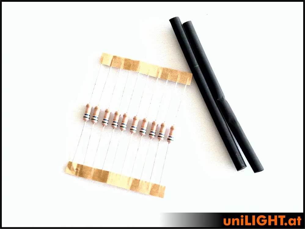 Leistungswiderstände um die Standard 2S LiPo Batterien gegen 3S LiFePo (9.9V) ersetzen zu können. Der Artikel beinhaltet Widerstände für 040, 080 oder 120 Leuchten, die einfach zusätzlich zu der 2S Konfiguration eingelötet werden müssen.